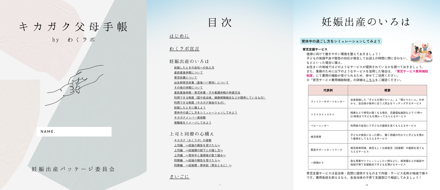 妊娠・出産の情報って自分で集めないといけない、かつ、自身 or パートナーが妊娠してから慌てて収集する人がほとんどのように思います。 だから準備するものがすっぽ抜けたり、受けられるはずの制度を享受できなかったり、 妊娠中・出産後の過ごし方をイメージする時間も持てないまま出産を迎えてしまったり、そのために他の社員に仕事のしわ寄せがいってしまったり…と「働きがい!」とか言ってる場合ではなくなってしまうのです。 キカガクは若い会社なので、これからそのような立場を経験する可能性がある、というメンバーが多く、ちょっと年上で子持ちの私ができることは何だろうと考えたときに、 自身 or パートナーの「妊娠前」に読めるハンドブックを用意しておけば気軽にいつでも読んでもらえるんじゃない? と思いつき、作成を進めたものが「キカガク父母手帳」です。