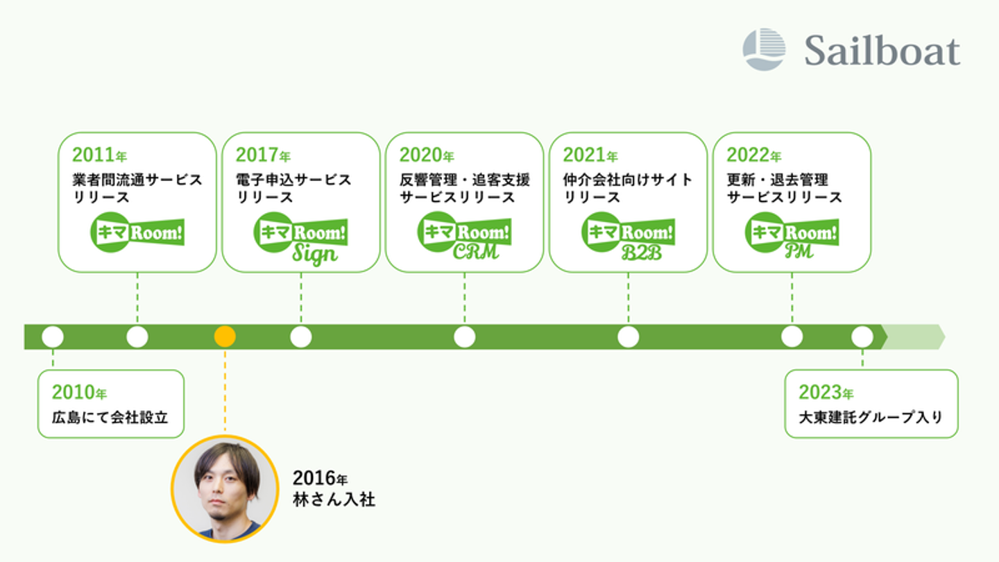 私が入社したのは2016年。セイルボートが設立されて6年目でした。一番最初のプロダクトである「キマRoom!」は、賃貸物件の業者間流通システムとして広島で既に高いシェアを誇っており、私はこのプロダクトの追加機能開発や外部連携を担当するところから始まりました。その後、電子申込システム「キマRoom! Sign」・反響管理システム「キマRoom! CRM」なども担当し、昨年リリースされた更新/退去の管理システム「キマRoom! PM」ではリードエンジニアを務め、ほぼ全てのプロダクトに関わってきました。