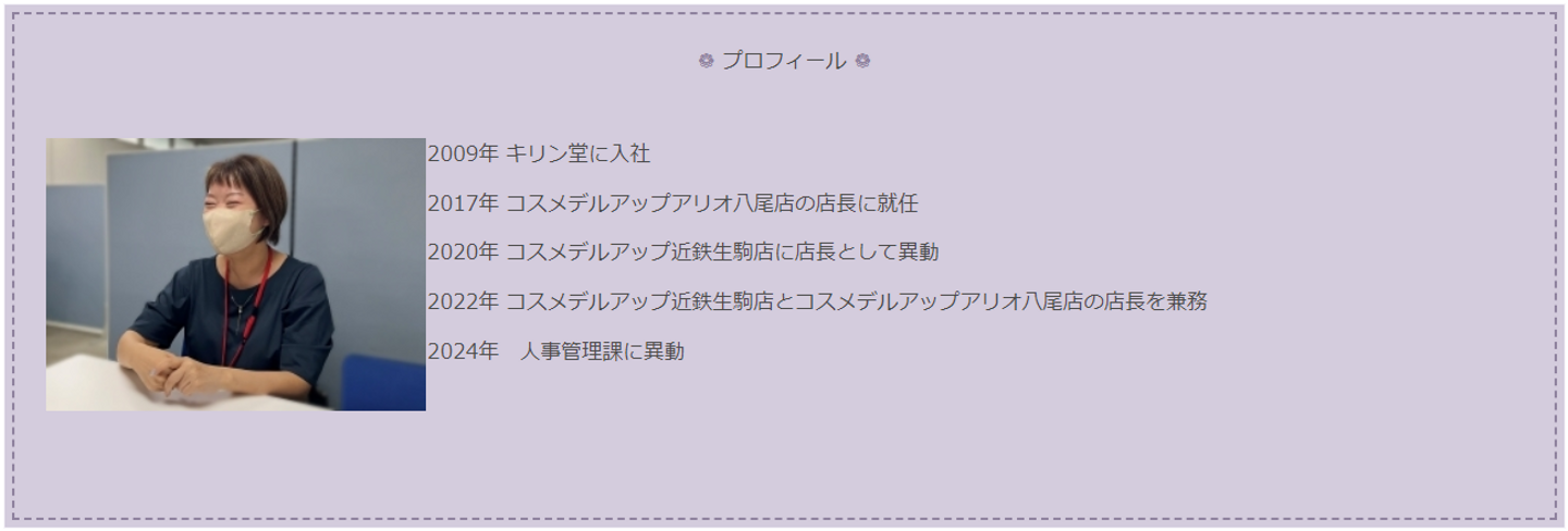 女性の活躍推進が求められている中で、キリン堂でも、多様な方がイキイキと働ける会社として、女性の活躍の場も広がる会社となりたいと考えています。