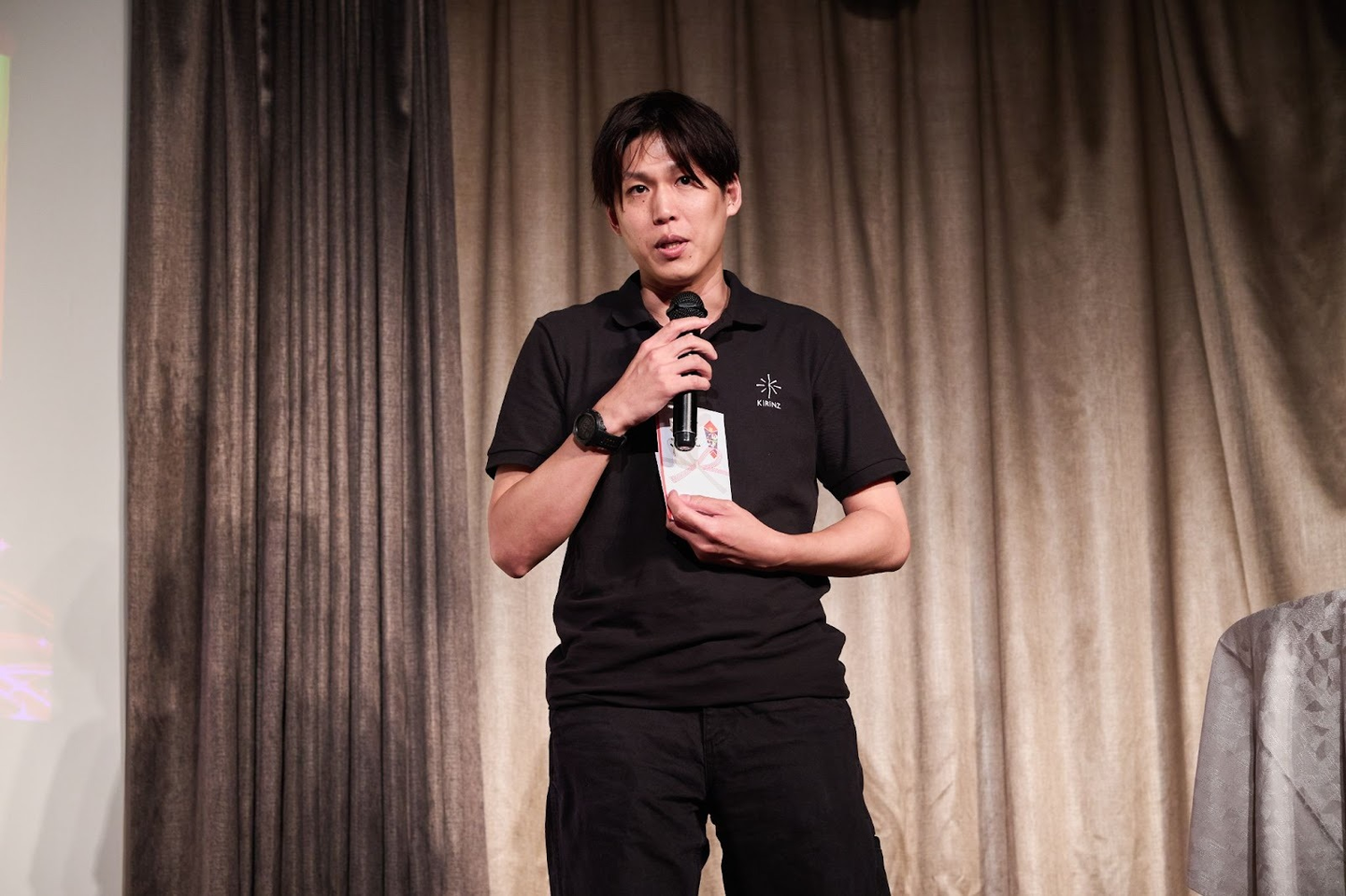 続いて、代表の鵜池が登壇。前期の事業報告と共に、KIRINZが次に向かうべき未来について語り始めました。そこで共有されたのは、「推し活市場でNo.1を目指す」という、これまでの事業領域をさらに拡大する新たなビジョン。この大きな目標に、会場からは驚きと期待のどよめきが起こります。