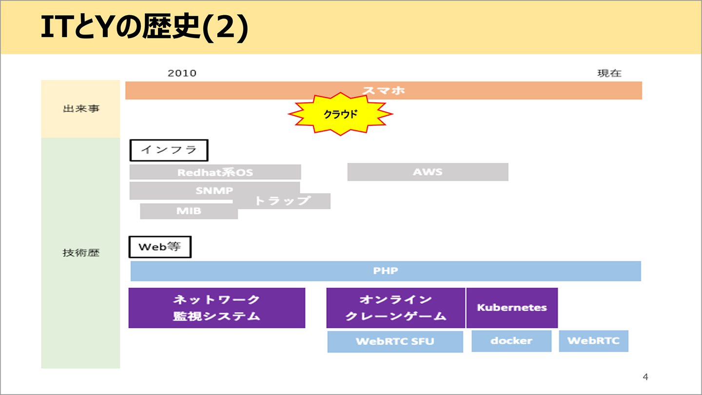 web等では主にphp開発を行う。ネットワーク監視システム、オンラインクレーンゲームなどを開発。kubernetesも印象に残っている。
