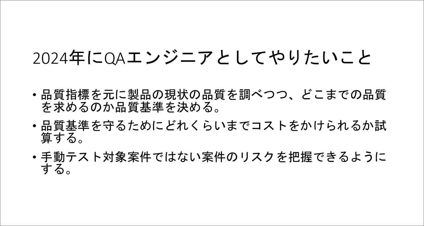 →求められる品質基準をクリアした状態で、コストかけすぎず、納期までにリリースできるようにする