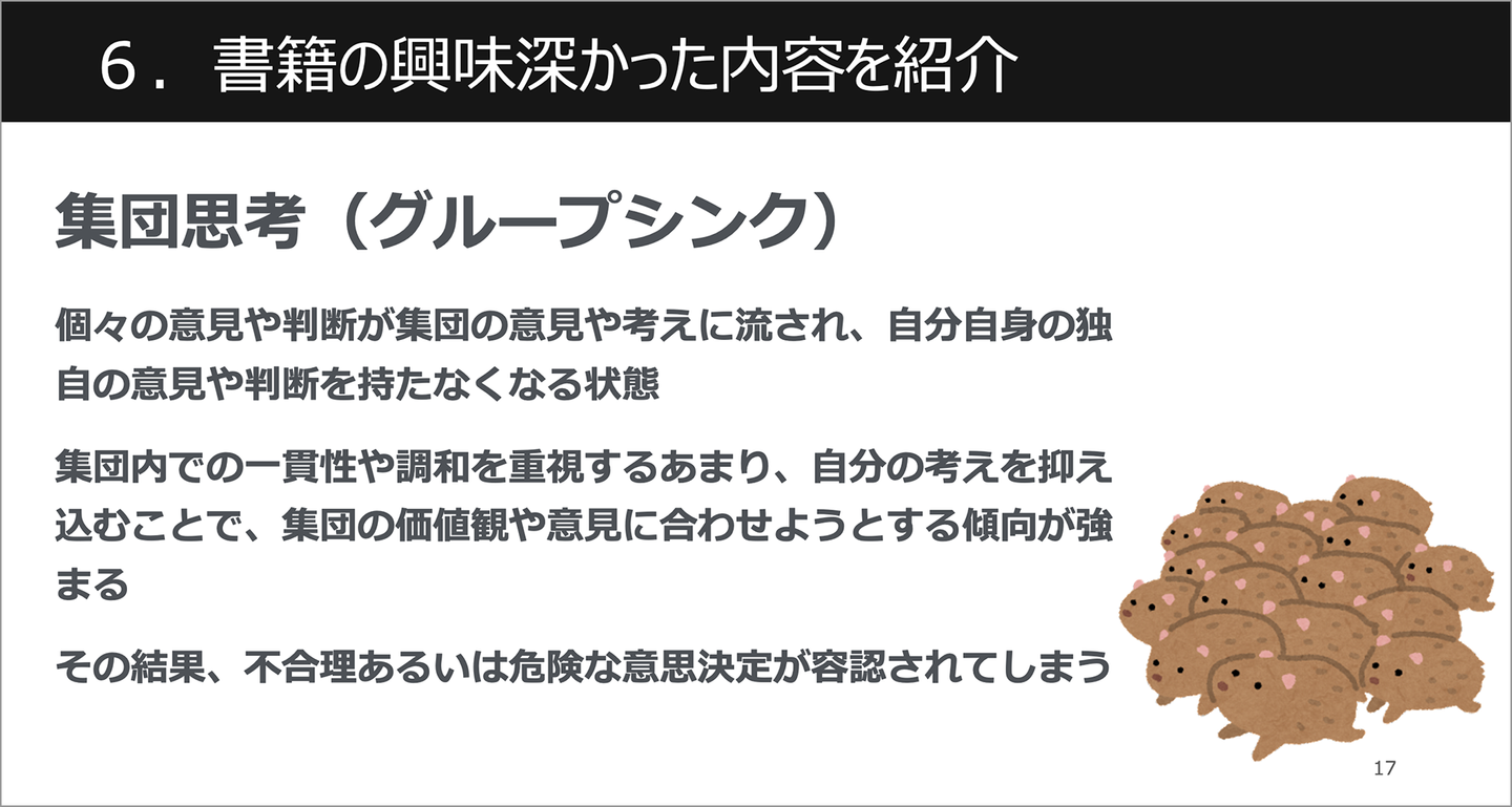 ・集団思考(グループシンク):集団の意見に流され個人の意見や判断を持たなくなること