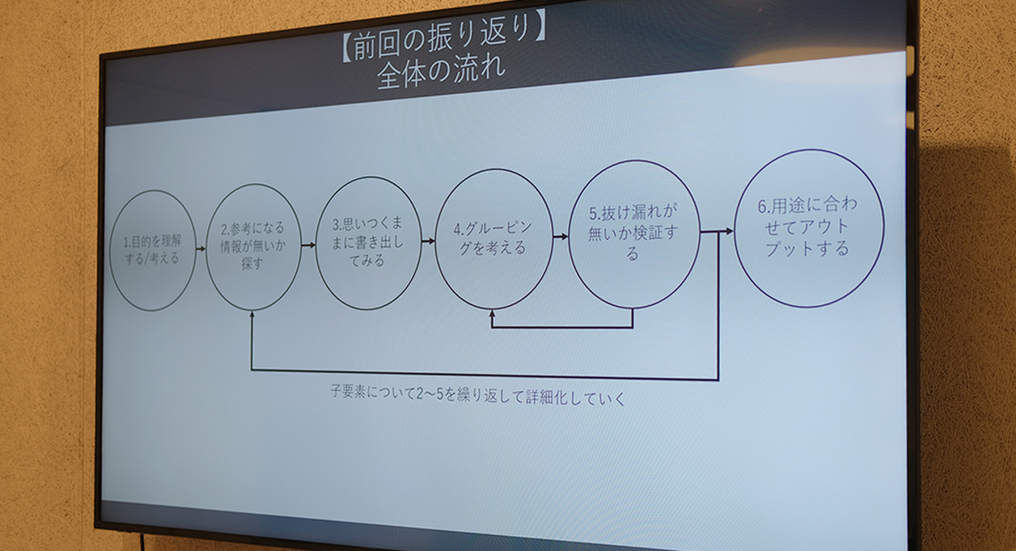入社当初は、実際の仕事でロジカルに伝えられずに「どうすれば伝わるんだろう。」と悩んでいたのですが、答えがここにあったんだなと知るきっかけになりました。その後、メンバーとブレストする時にもMECEを用いて「この要素足りてないんじゃない?」とか「それはちょっと本質の問題とは違うよね」と深くディスカッションできるようになったと思います。また、知識をつけるだけではだめで、どんどん実践を重ねる事が重要なんだと知ることもできました。