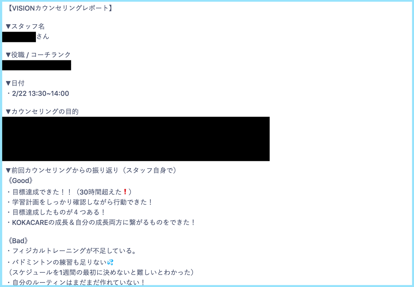 希望する頻度でVISIONメンターとカウンセリングをし、自分のスキルアップを振り返っていきます。もちろん1週間ごとにPDCAを回す仕組みなので、1週間に1回カウンセリングをするのが効果的ですが、そもそも『VISIONは、自分のためにやるもの』なので、頻度もタイミングも、スタッフの好きなタイミングで設定します。そこが一般的な研修とか、1on1とは違うところです。