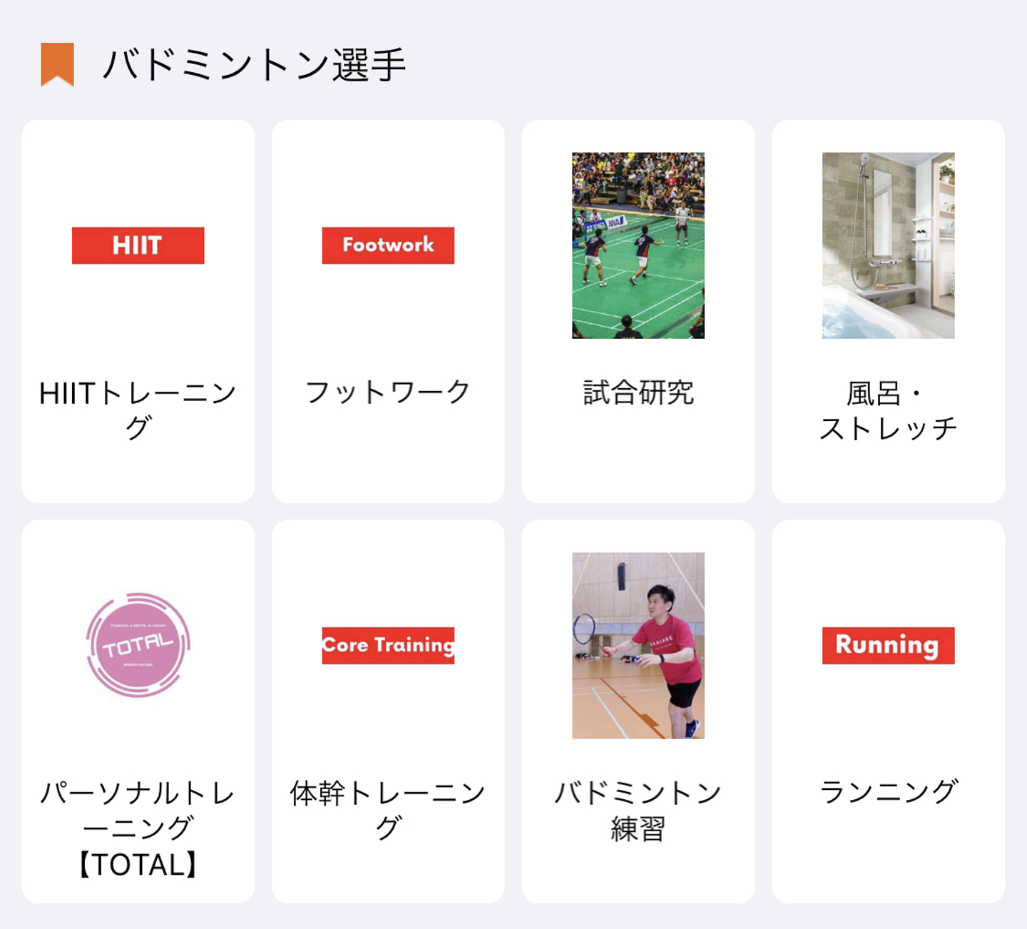 そこから、できたカテゴリー毎に行動目標を立てます。選手であればランニングとか、体幹トレーニングとか、練習とか。練習ももっと細かく分けてもいいですね!