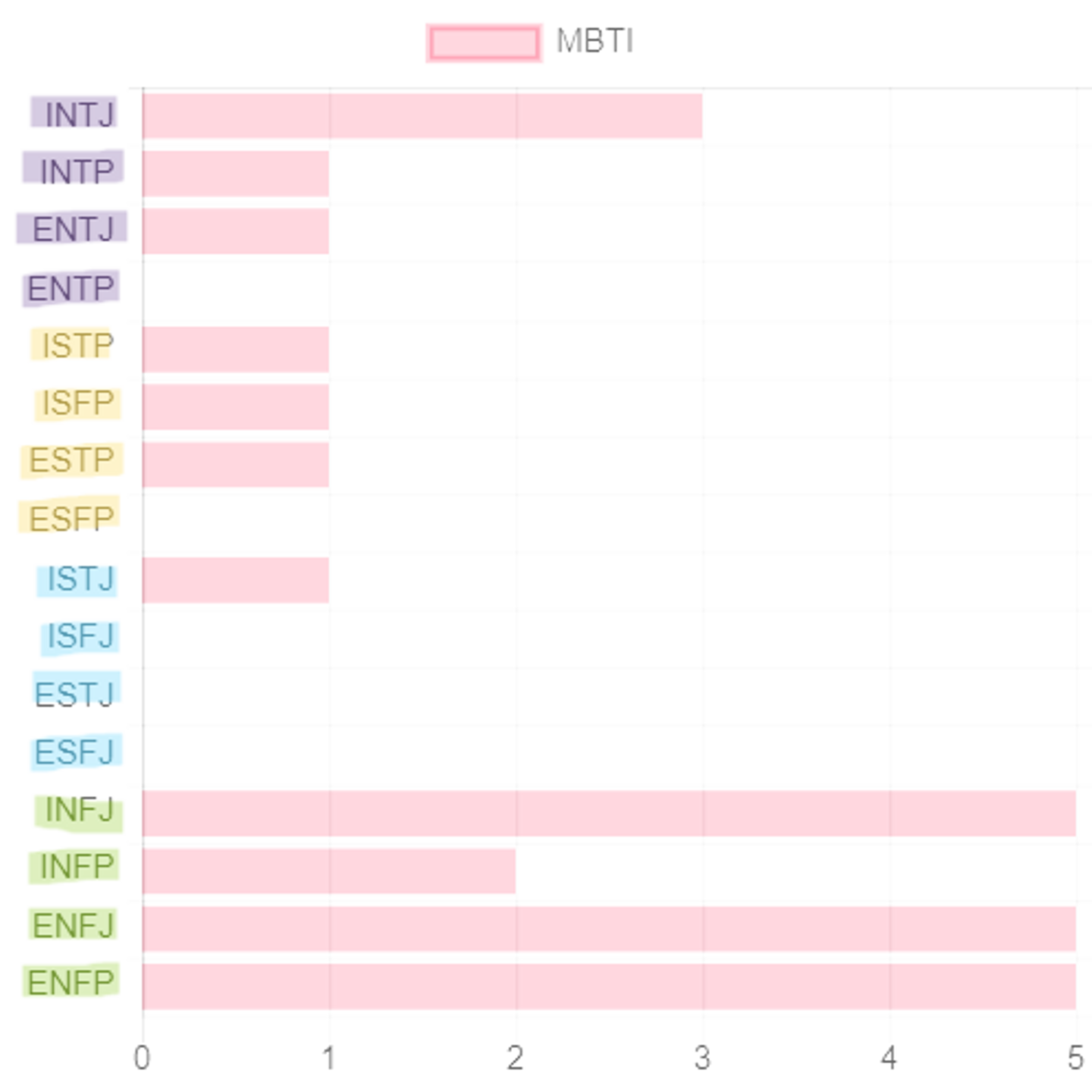 ・INFJ...哲学的な理想主義者!(Webマーケターさん🐈/ベテランコーダーさん🐻❄️/フロントエンドエンジニアさん🐍/ライターさん🥨/経理・労務担当さん🦭 計5名)