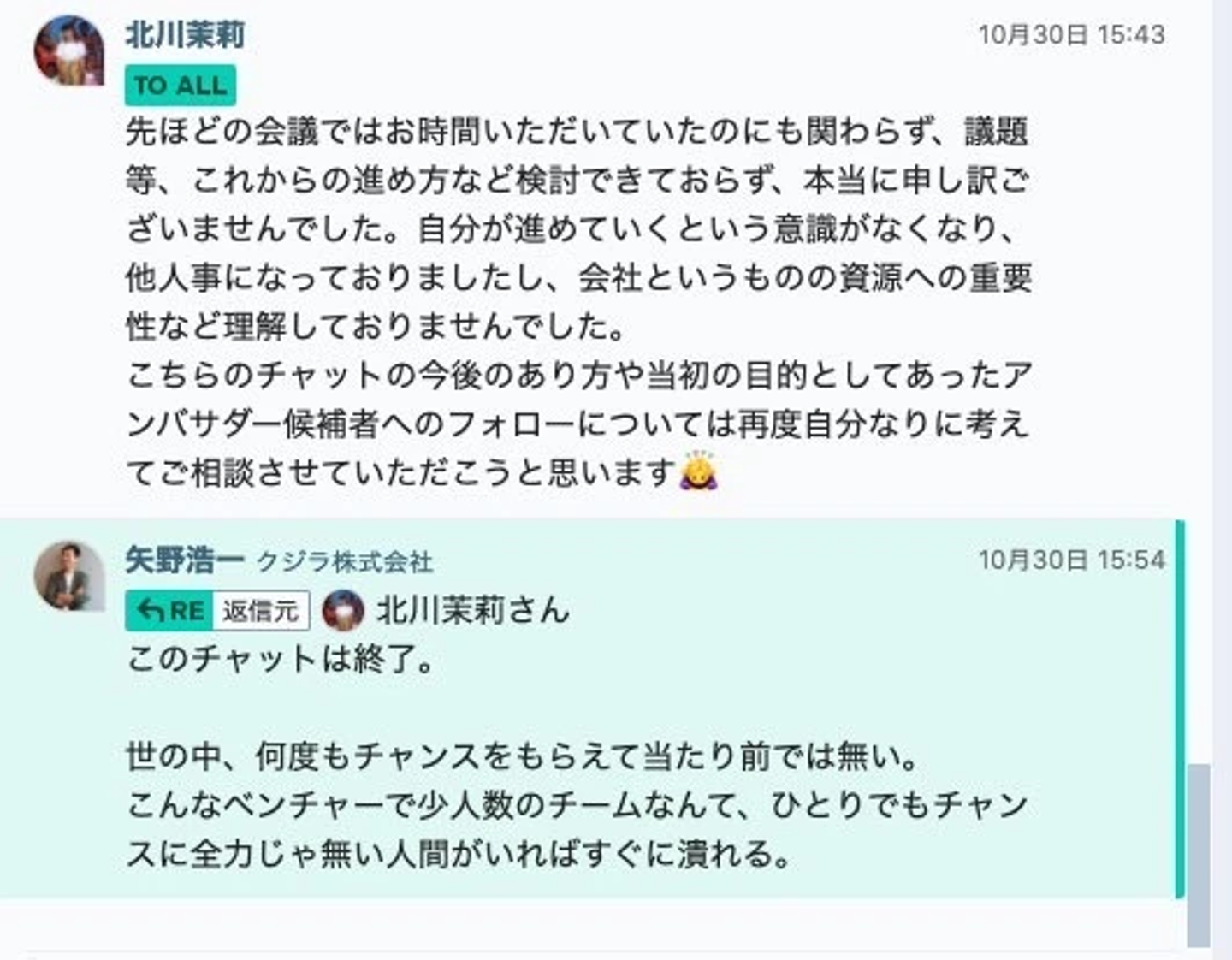 後日、反省と謝罪をコメントしましたが、矢野からは「世の中、何度もチャンスをもらえるのが当たり前じゃない」と、企画運営用のチャットグループも削除されました。