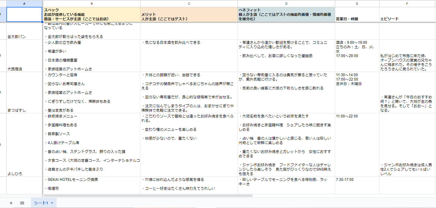 その時研修で教えてもらったことが接客の紹介の仕方にも使えるんじゃないかと思って、SEKAI HOTELの周辺にあるお店の価値の細分化をした表を作ったんです。