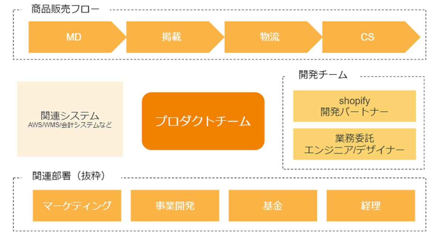 このような状況だったため、Shopify移行プロジェクトでは、多数の関係者が存在するかたちとなり、私が所属するプロダクトチームが関係者を取りまとめ、プロジェクトを進捗させる役割を担っていました。