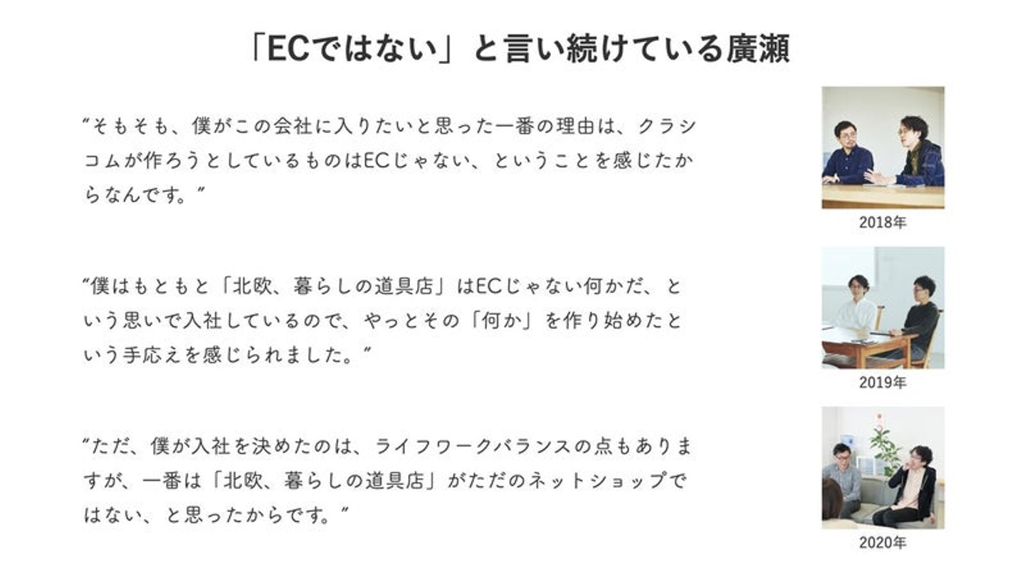 はじめに「目に見える変化がそこまであるわけでもなく」と書きました。でもそれは意図して変化してこなかったわけではありません。まさに変更容易性が低いがために、変化させたくてもさせられなかったという面もあります。「ECとしてはある程度の形が構築できているように思えます」とも書きましたが、僕個人は「北欧、暮らしの道具店」がいわゆるECのままであることは勿体無い、ぶっちゃけて言うと「つまらない!」と考えています。