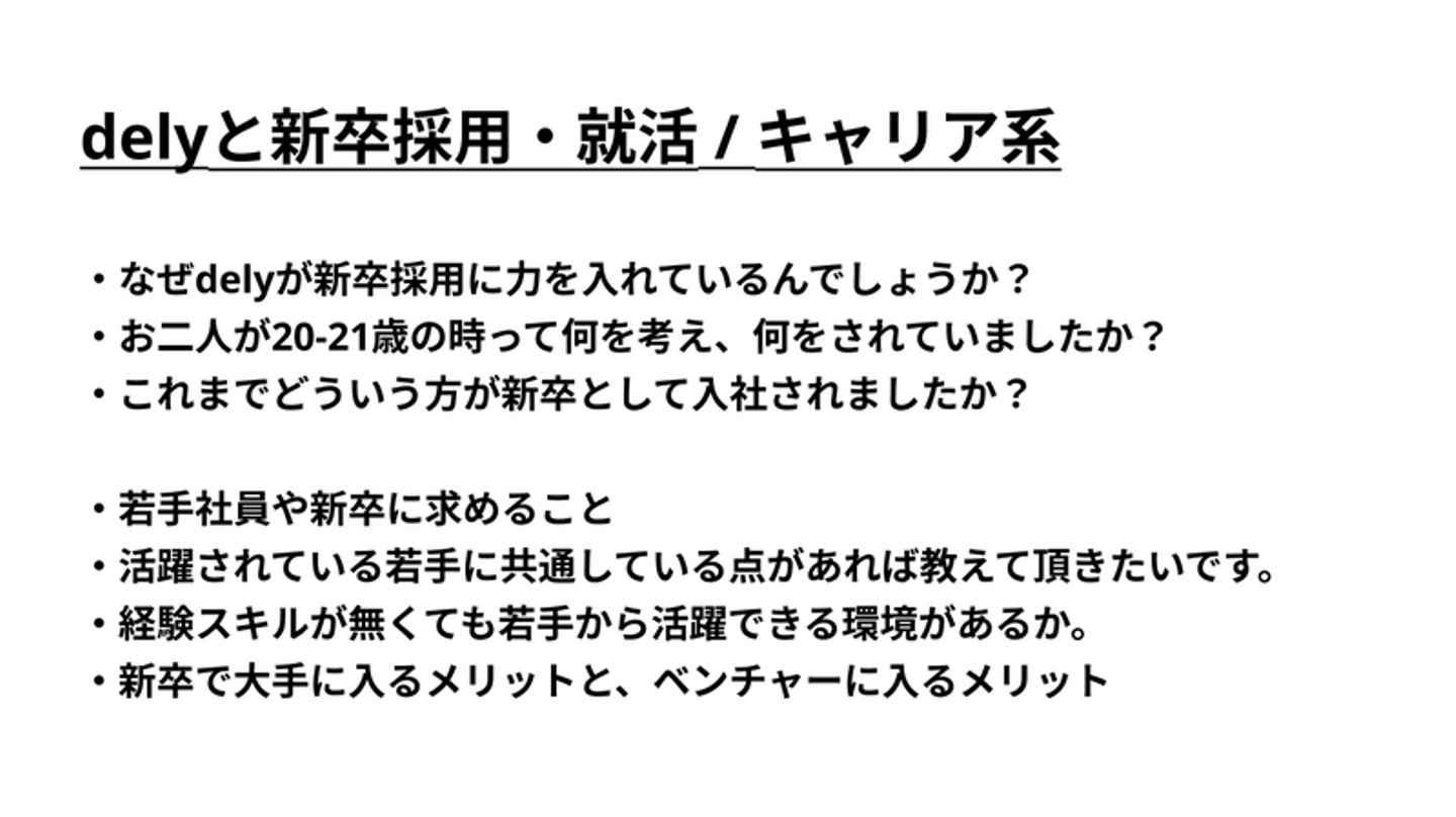 23卒・24卒を中心に、delyの事業や組織、未来について解像度を高めたい方はもちろん、ベンチャー企業を新卒キャリアとして選択する先輩社員の働き方・就活時代の話を聞きたい方などが参加いただきました。