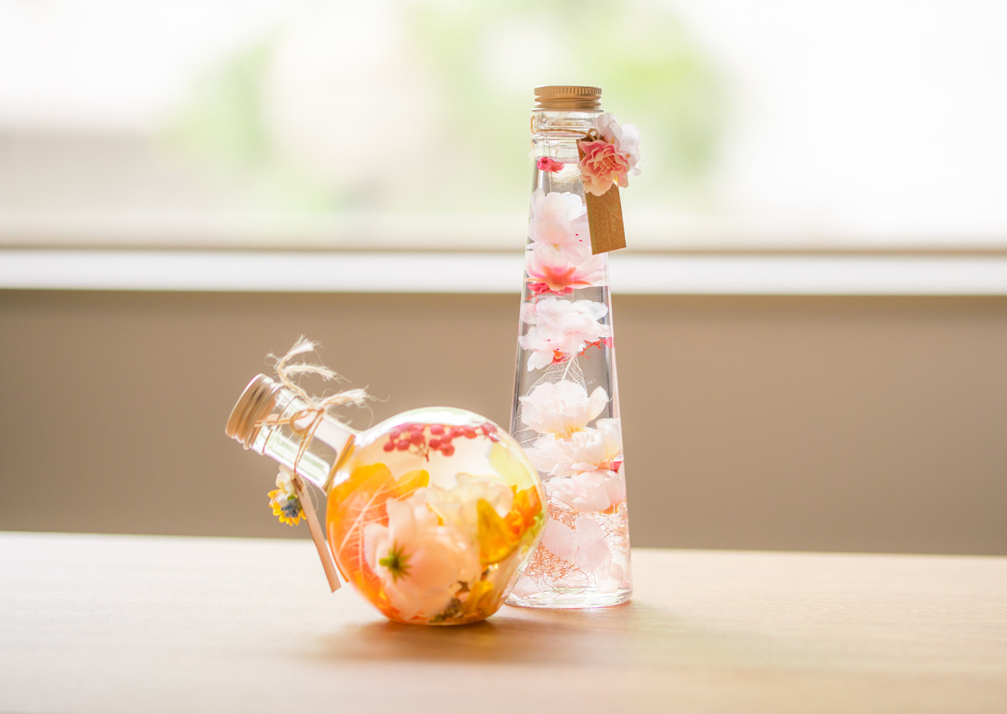 herbarium(ハーバリウム)は「植物標本集」という意味で、押し花もそのひとつです。今回作成したハーバリウムのようにドライフラワーや造花をオイルと一緒に瓶に詰めたものは、おしゃれなインテリアとして人気があります。