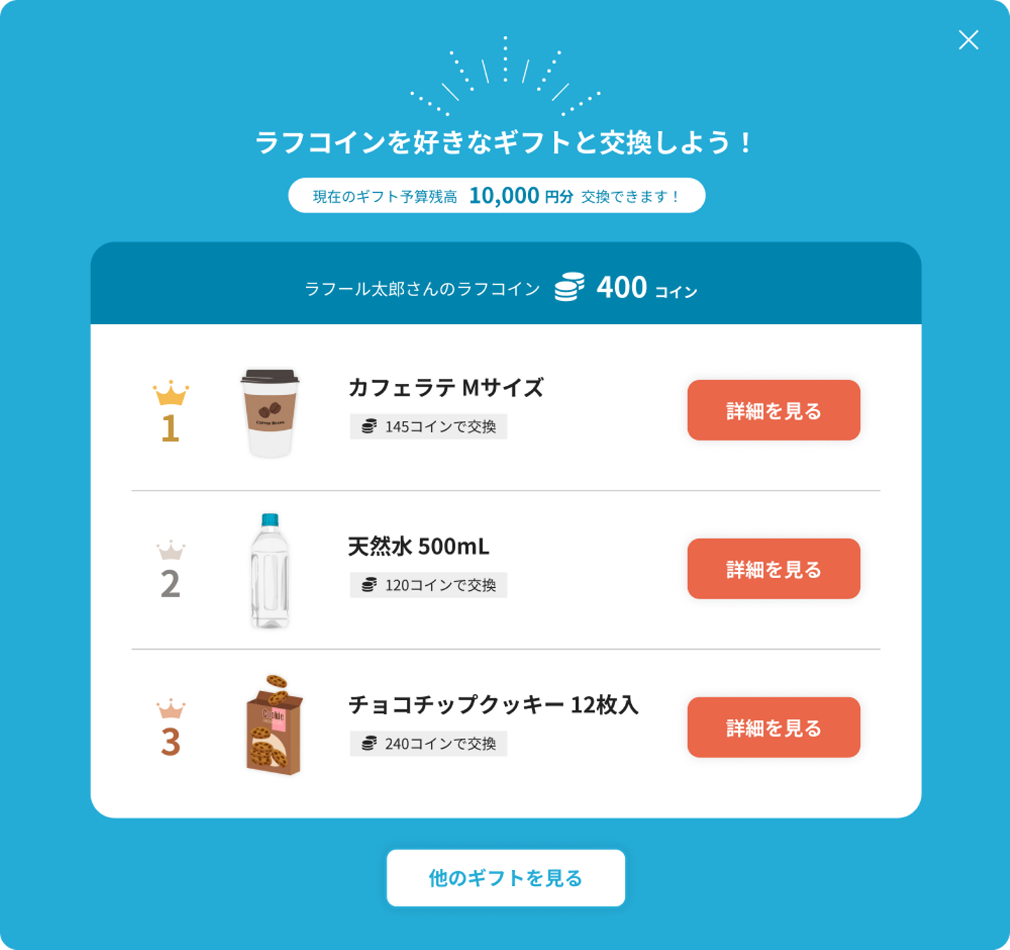 本アップデートでは、「ラフコイン ギフト交換ランキング」を実装。人気の商品を簡単にチェックでき、週に一度ランキングが更新されるため、ご担当者様から従業員へのコミュニケーションの機会としてもご利用いただけます。