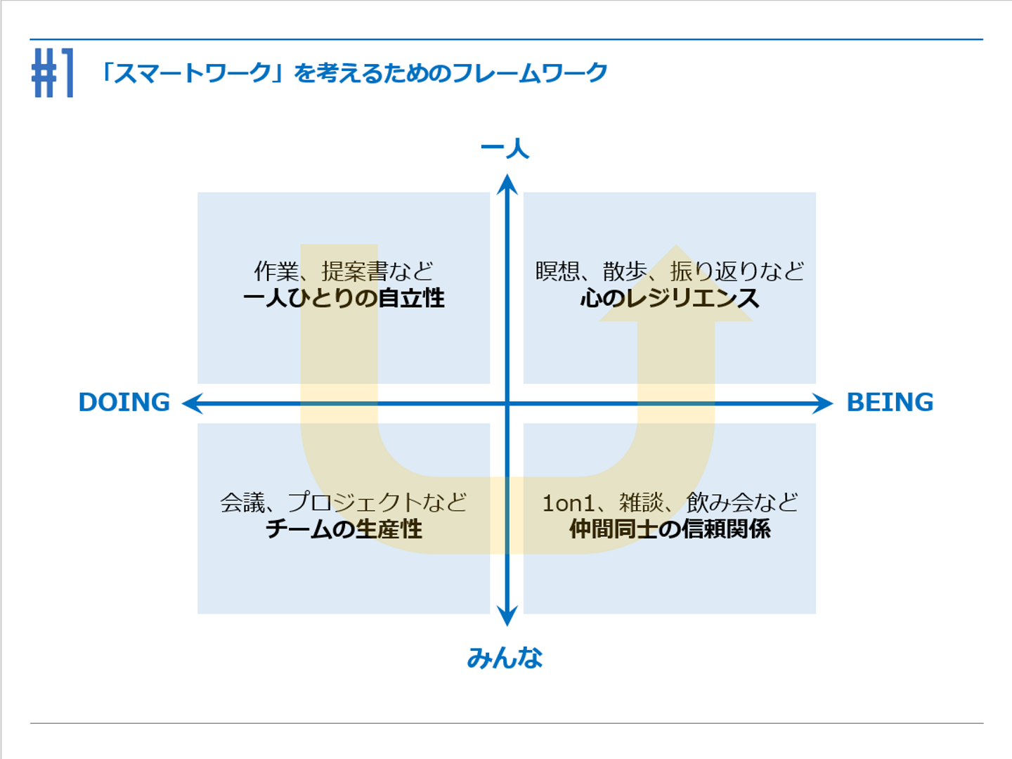 前回の記事で、アフターコロナの働き方を考えるうえで、一人 vs みんな、DOING vs BEINGというフレームワークを紹介させてもらいました。今回は、このフレームに沿って、コロナに負けないスマートワークwayを勝手に20選、紹介させていただきます。