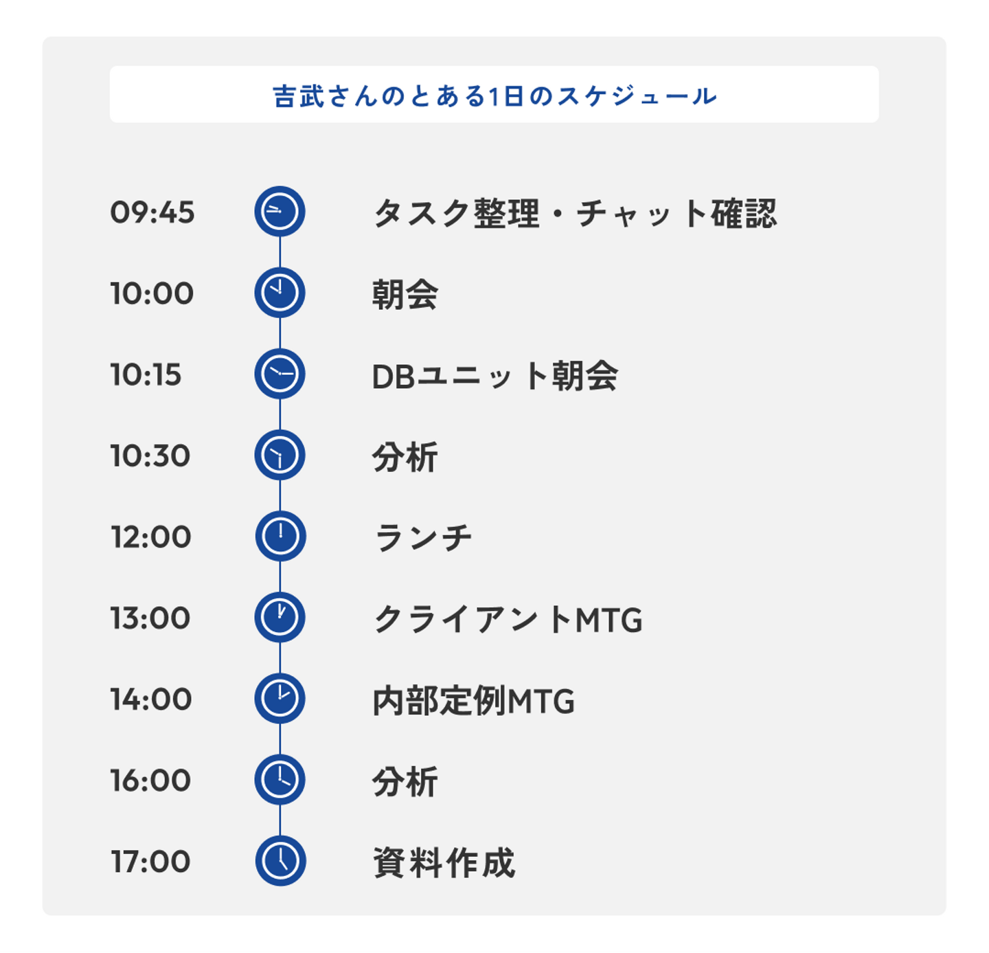私はどちらかというと夜型なので、稼働は少しゆっくりめの10時前頃から。午前中に社内の共有事項の確認や分析を行い、午後はクライアントや内部の打ち合わせをこなしつつ、夕方以降に深い分析や資料作成に集中するというスケジュールで動くことが多いですね。