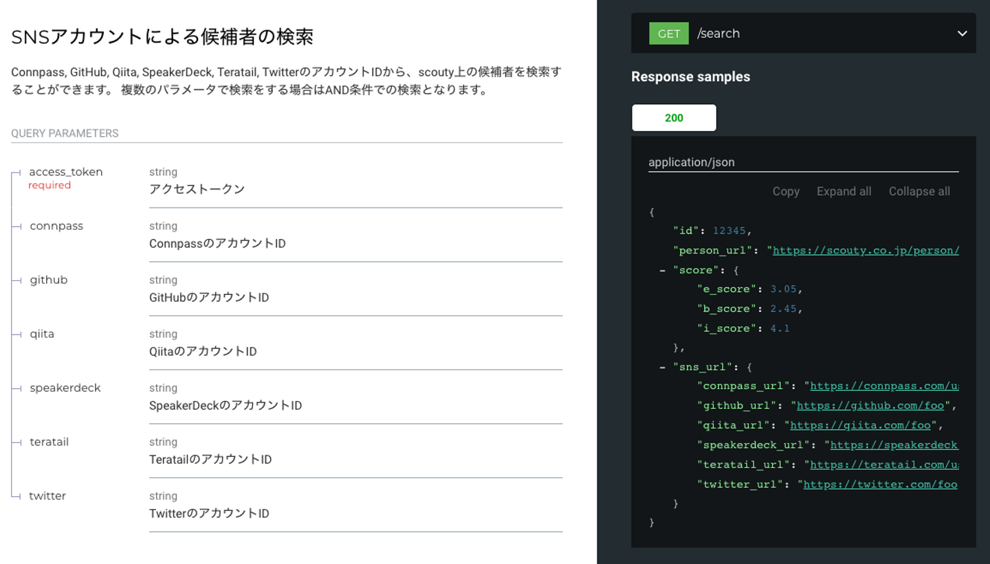 各種SNSのアカウントIDをクエリで投げると、そのアカウント持ったscouty上の候補者の情報が返ってきます。