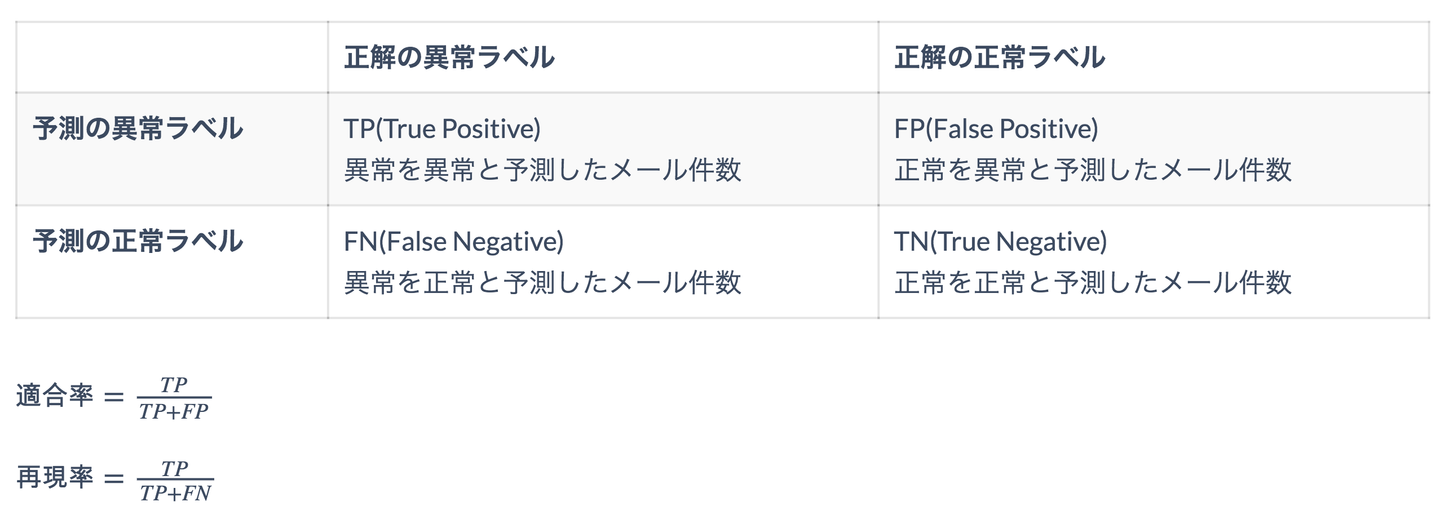 適合率、再現率の計算は、既存メールに付けられた正解の正常、異常ラベルとモデルで予測した正常、異常ラベル結果を用いて計算します。今回の異常メール検知課題に代入すると以下のように解釈できます。