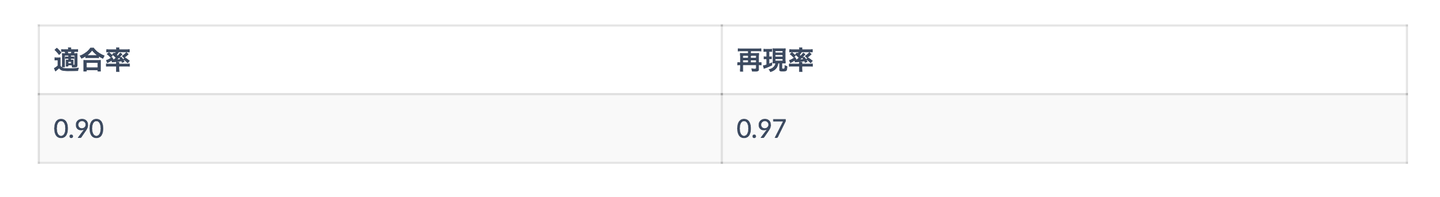 今回作成したモデルの評価には機械学習の分類問題でもっとも良く使われている適合率(Precision)と再現率(Recall)を使います。
