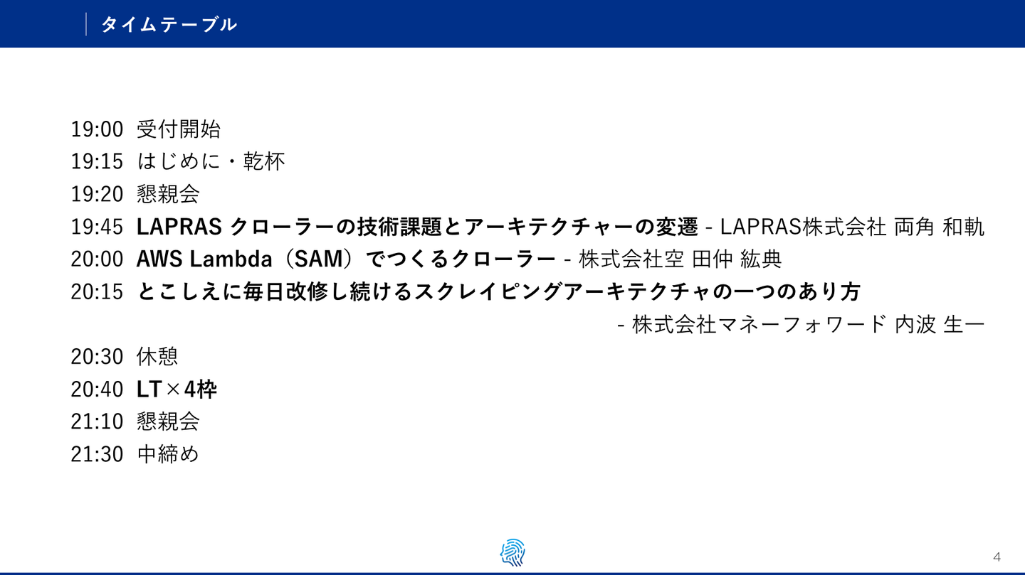 前回の scouty Crawler Night 2019 に続き今回は第二回目のCrawler Nightとなりました。クローラーに関するイベント/勉強会は探してもほとんどありませんが、趣味や仕事でクローラーを書いている方はたくさんいるように思っています。気をつけないと法律を違反しやすい分野でもあるのでなかなか情報をアウトプットしづらいのだと思いますが、そのような特性を持つ分野だからこそ、私達はこうやってホワイトにやっているよ!という発信が大事だと思っています。