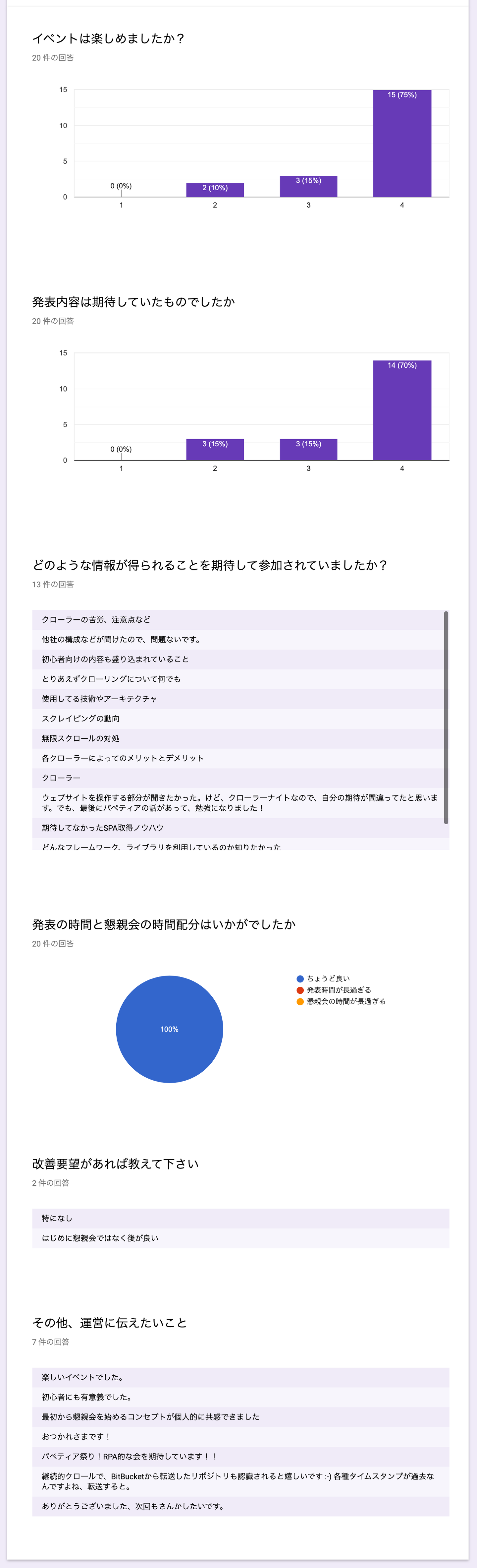 一方で懇親会で個別に話を聞いていると、業務でクローラーを開発している人向けのアドバンストな内容が多く、これからクローラーを書いてみようとしている方へのビギナー向けの情報が少なかったという声もあり、こちらは次回のCrawler Nightのトーク構成のバランス調整時に気をつけようと思いました。