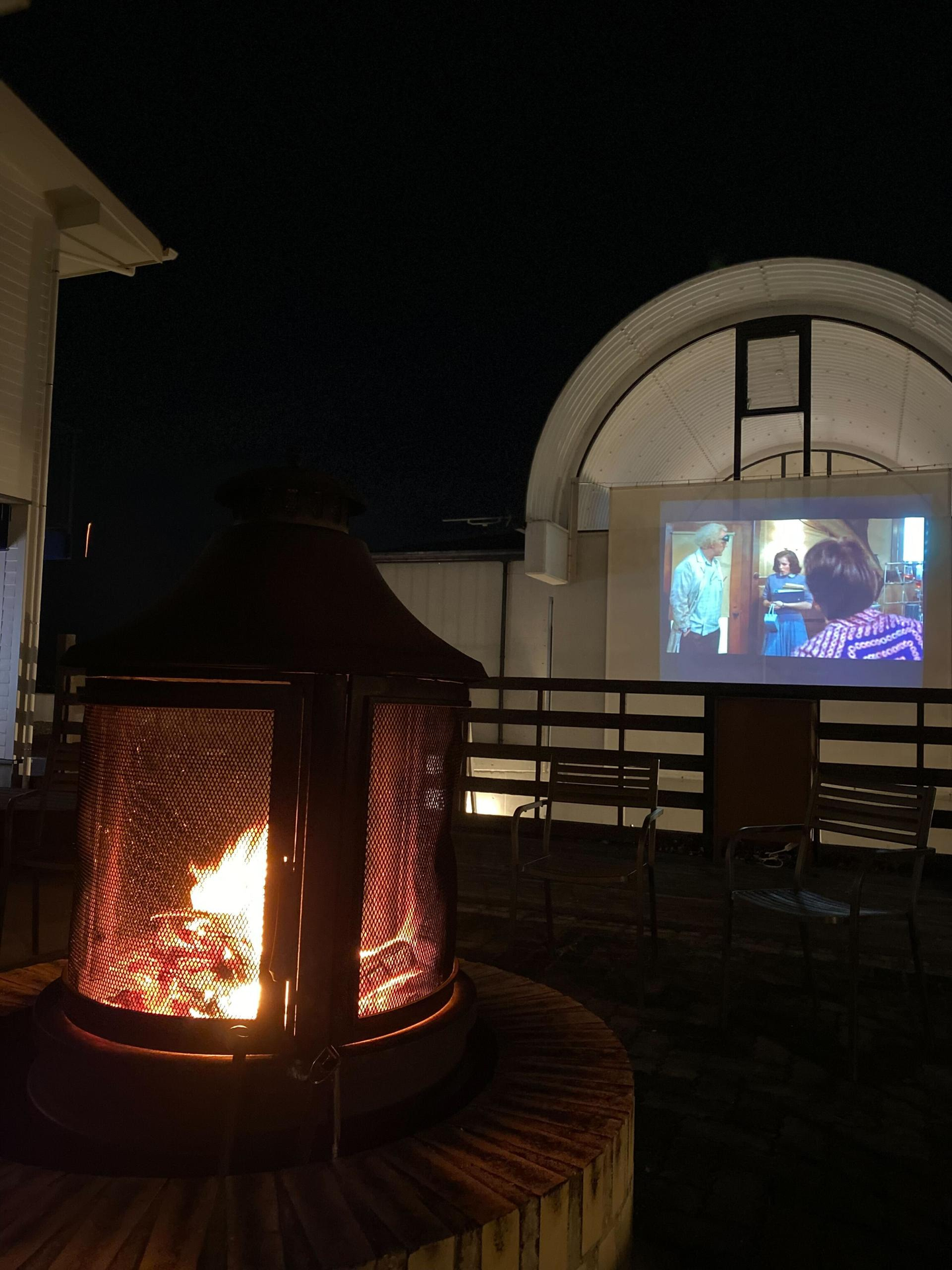 隣には焚き火スペースがあり、丸く団欒できる配置に。映画も投影されていて雰囲気たっぷりでした。