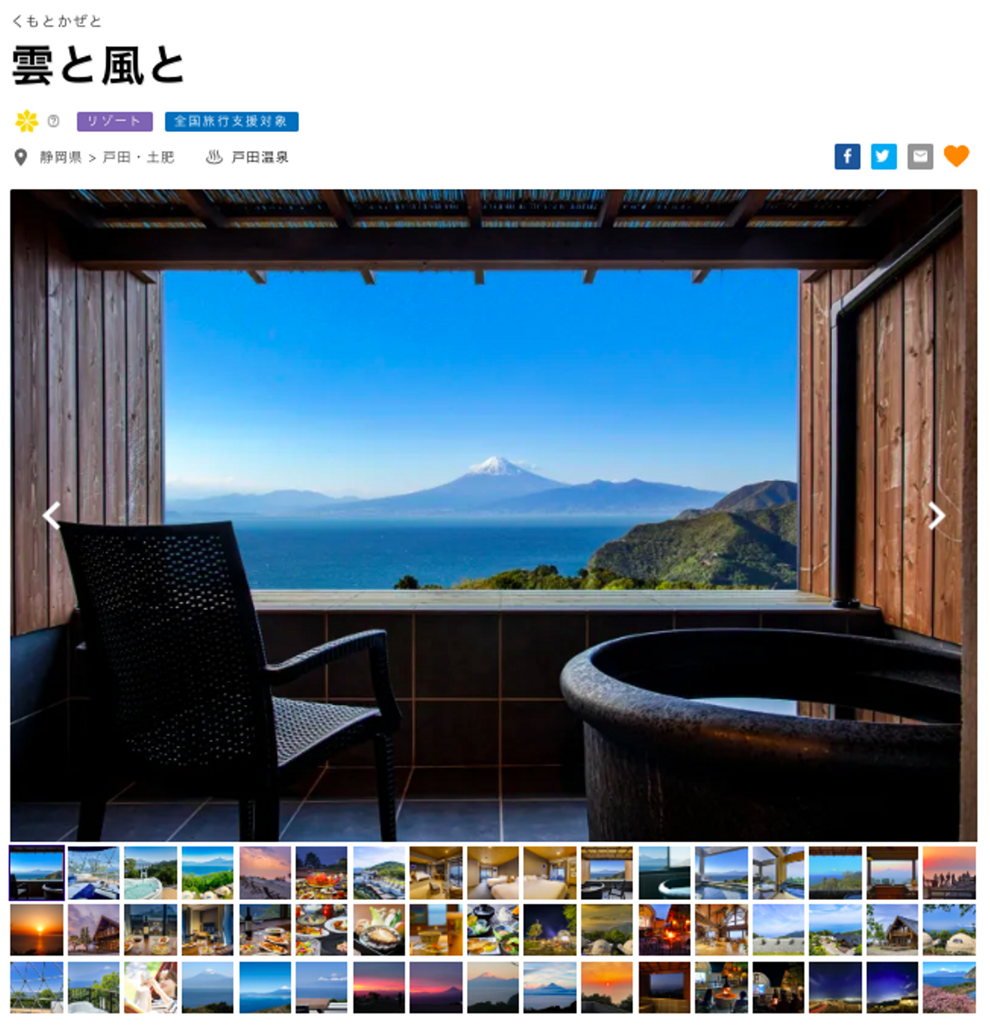 今回の旅の目的地は、ドライブにぴったりな伊豆です。Reluxで目的地や条件を絞り込み、ヒットした中から「雲と風と」を予約しました。一番惹かれた点は客室から望める富士山の絶景です。