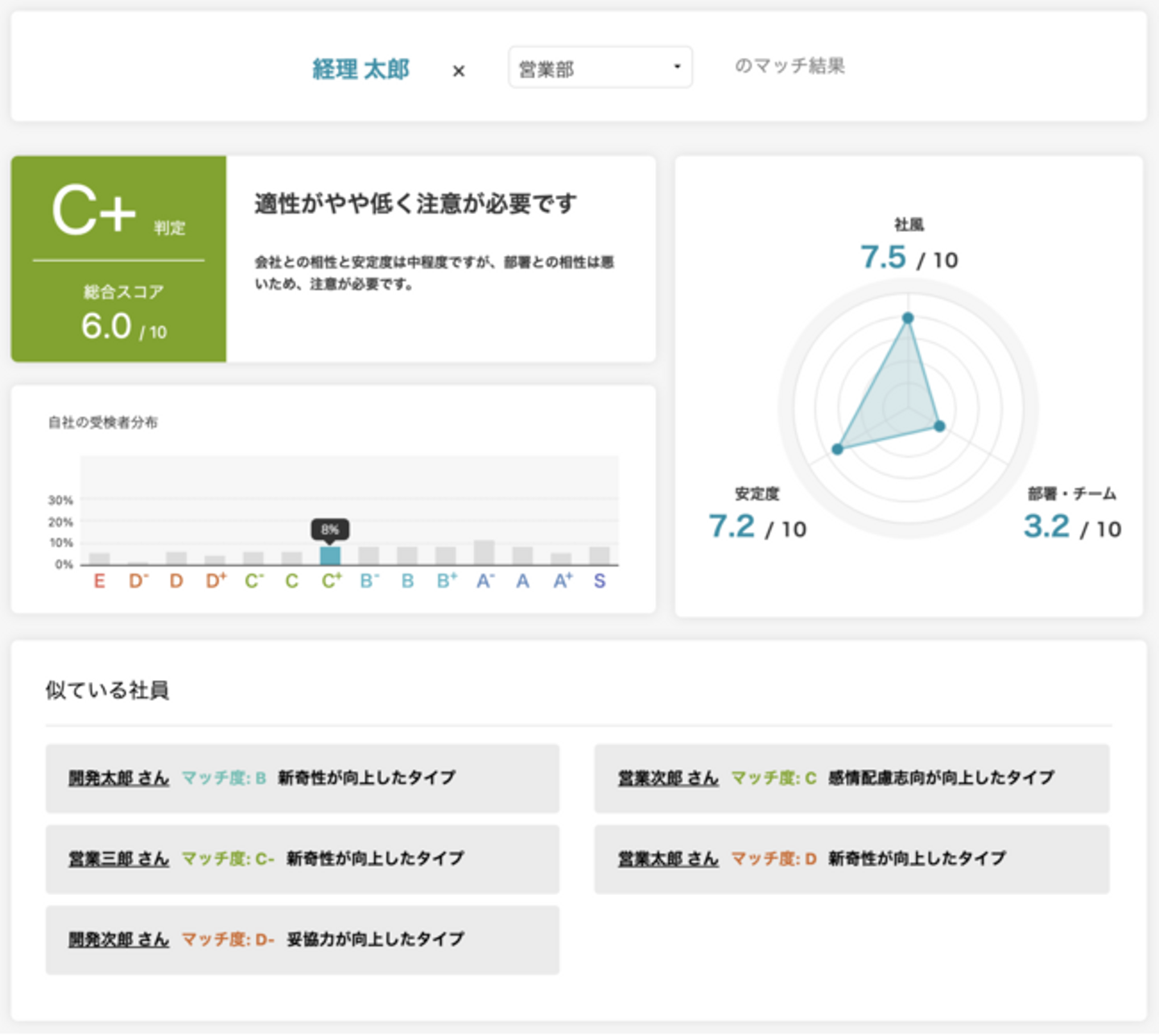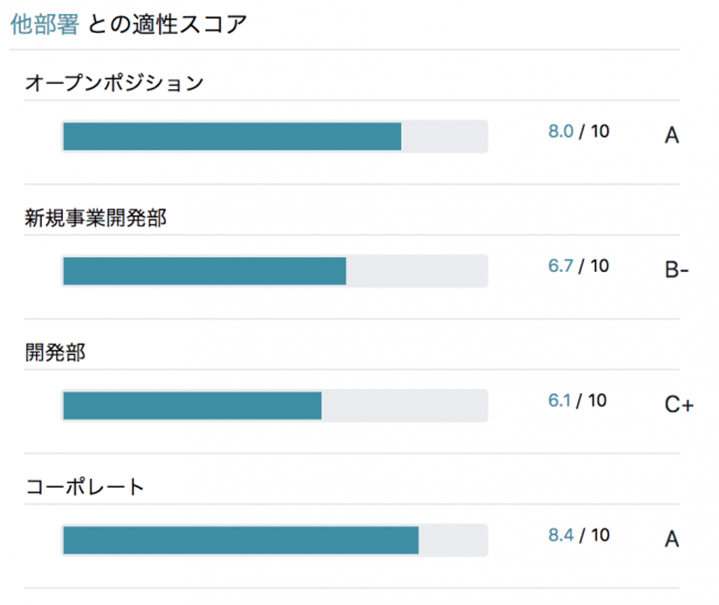 応募部署以外との相性も可視化されます。入社後の配属を加味した採用が可能になります。