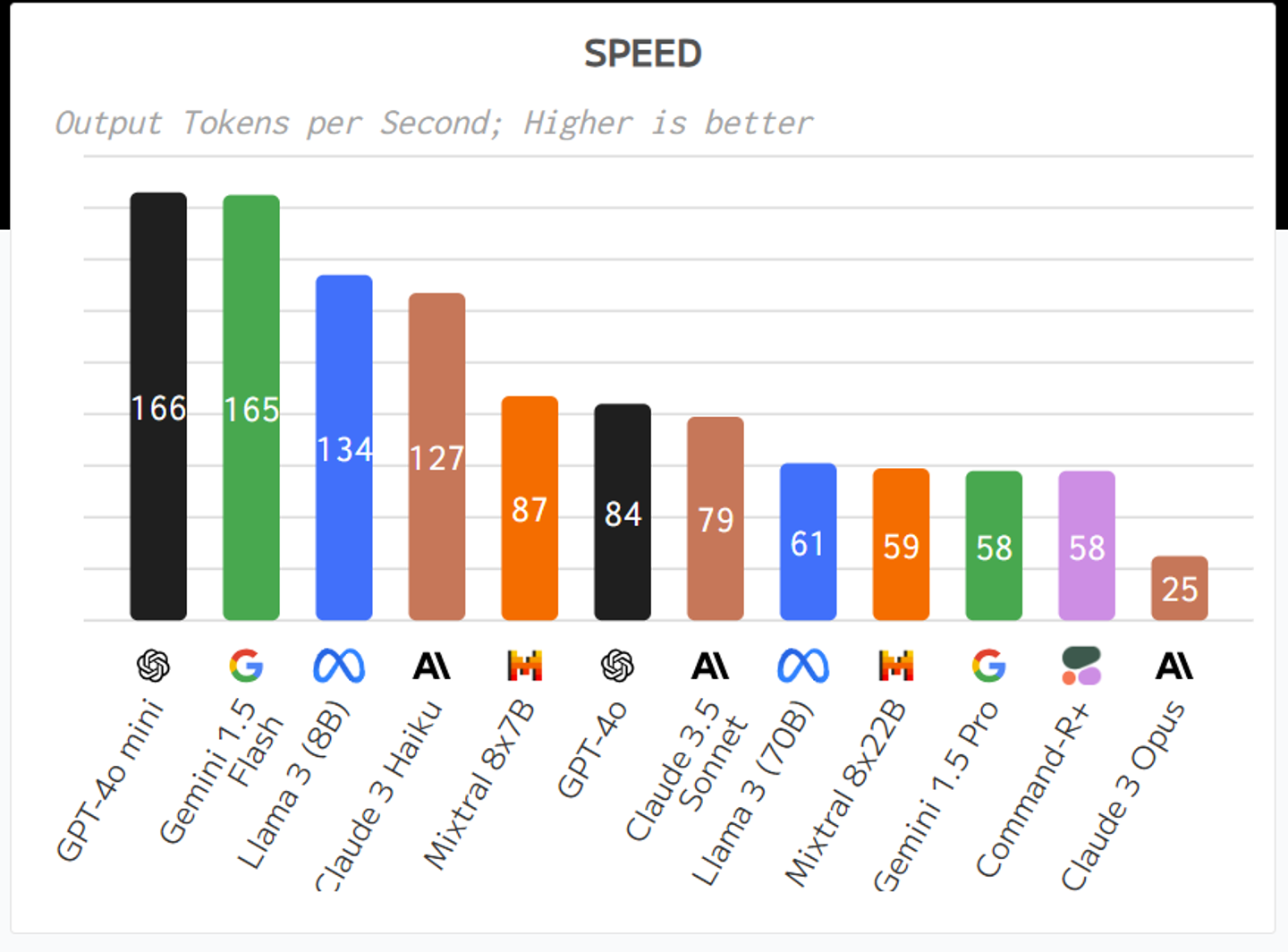 ほぼ最速のAIという評価がでています。インタラクティブな使い方をする場合は速さは結構大事です。仕事の速さに直結します。GPT-4o miniは最高です。(出典: https://artificialanalysis.ai/ )