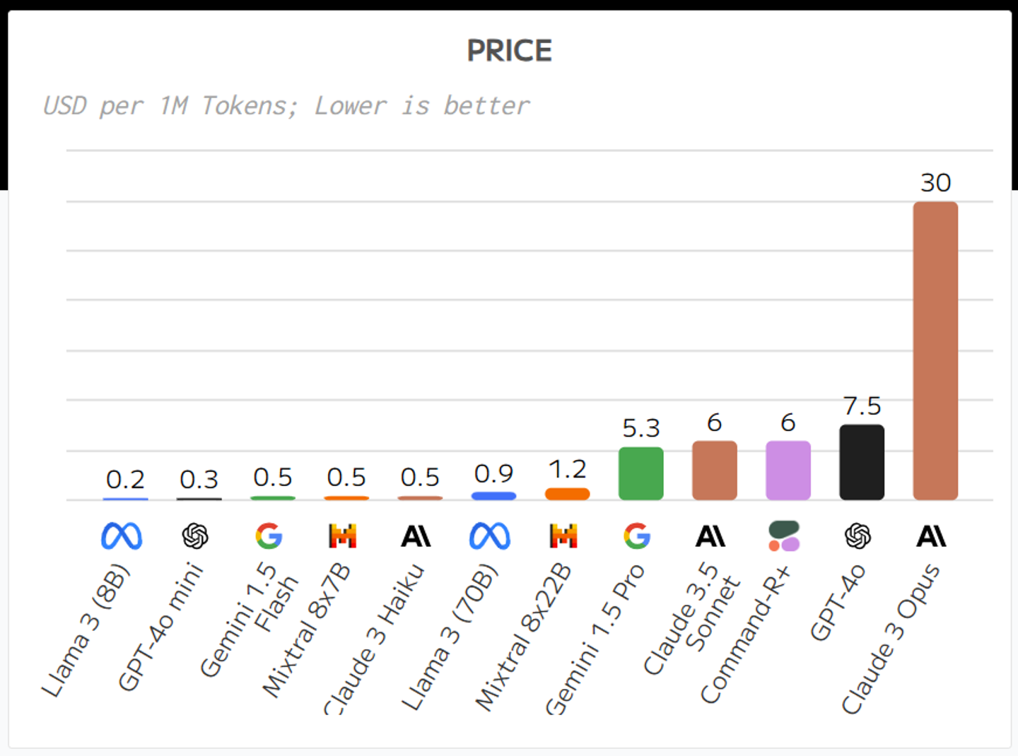最近のLLM(大規模言語モデル)は100万Token(日本語だと1文字1Token程度)あたりの値段で価格設定されていますが、入力が100万Tokenあたり0.15USD、出力が100万Tokenあたり0.60USDと、円安で苦しむこのご時世でもかなりお手頃な価格に設定されています。以下のグラフの左から2番目です。(出典: https://artificialanalysis.ai/ )