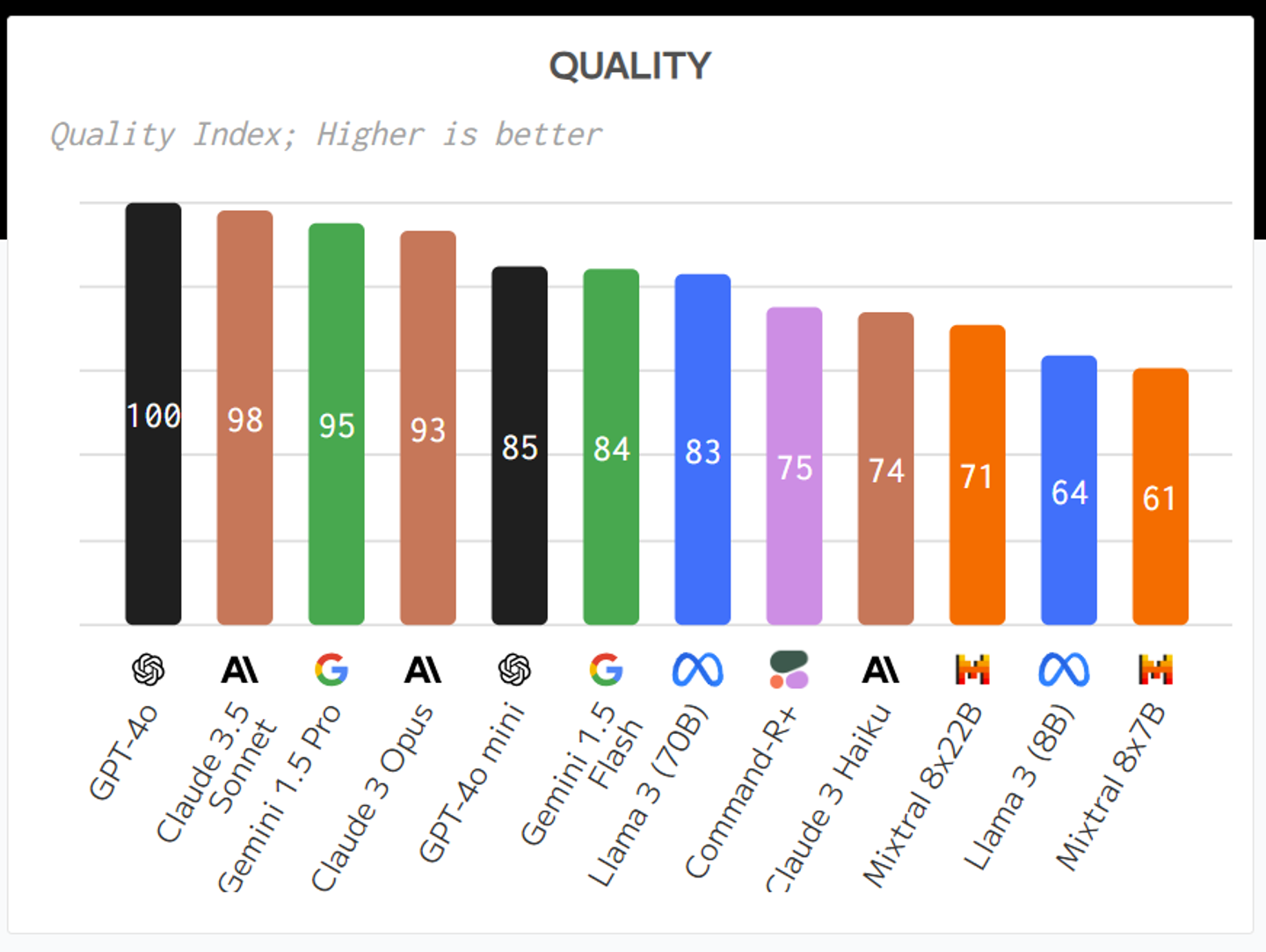 現在最高峰とされているAI、つまり、GPT-4oやClaude3.5 Sonnetには負けますが、初期のGPT4を超える性能を実現しています。かなり賢いAIです。賢さを殆ど犠牲にせずに激安で使えるのでとても汎用性が高いAIといえます。以下のグラフで85となっており、これはGPT4よりも上のスコアです。(出典: https://artificialanalysis.ai/ )