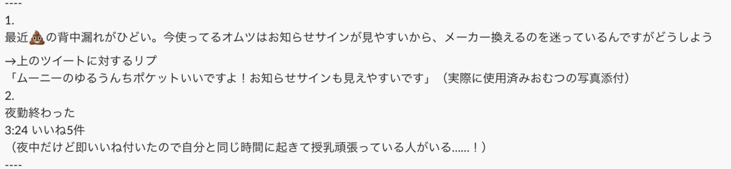 家族や友人に育児の悩みを相談することももちろんありますが、Twitterだとちょっとしたことでも聞きやすく、レスポンスも早いし、複数人から回答を得られますね。