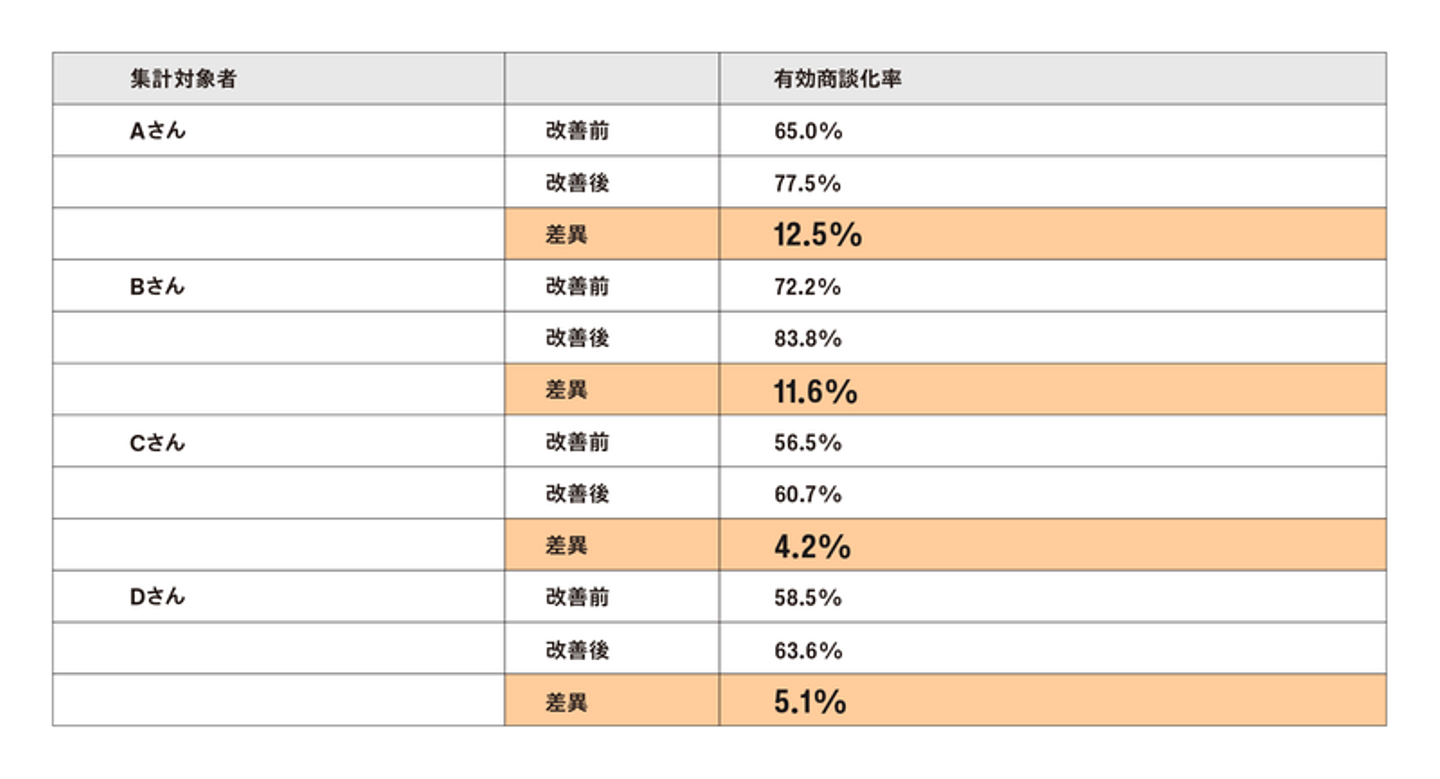 現にメンバーへの個別支援・指導の前後で、有効商談率の差異が大きく表れています。(『LegalOn営業術(基礎編)』の第2章から一部抜粋)