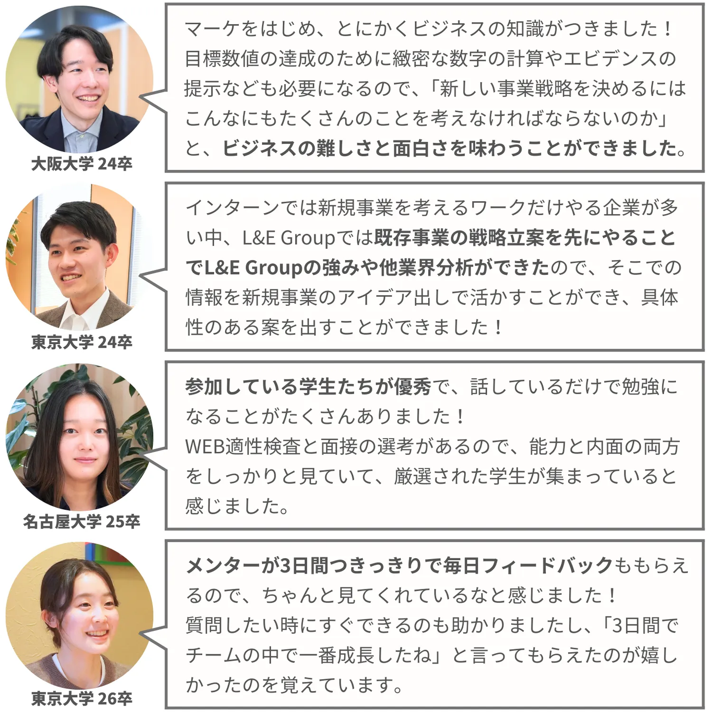 学生時代にL&E Group 3dayインターンに参加した先輩メンバーの生の声はこちら!