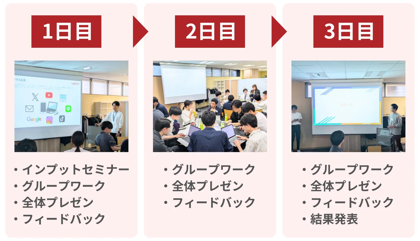 チームに3日間つきっきりで、学生主体でありつつメンターも一緒に議論に入り込むため、視座の高いアウトプットを作り上げることが可能。