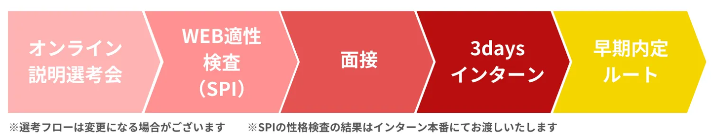 申込フォームから応募後、まずは説明選考会にご参加いただきます。そちらではL&E Groupの会社概要や事業内容、新卒採用育成方針、3daysインターン詳細について説明させていただき、最後に個人ワーク選考を実施する予定です。