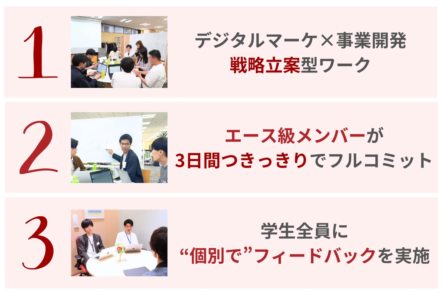 そこで今回は、「3daysインターンってどんな内容なの?」「参加するとどんなメリットがあるの?」などなど、インターンの特徴をご紹介!最後までぜひご覧ください!