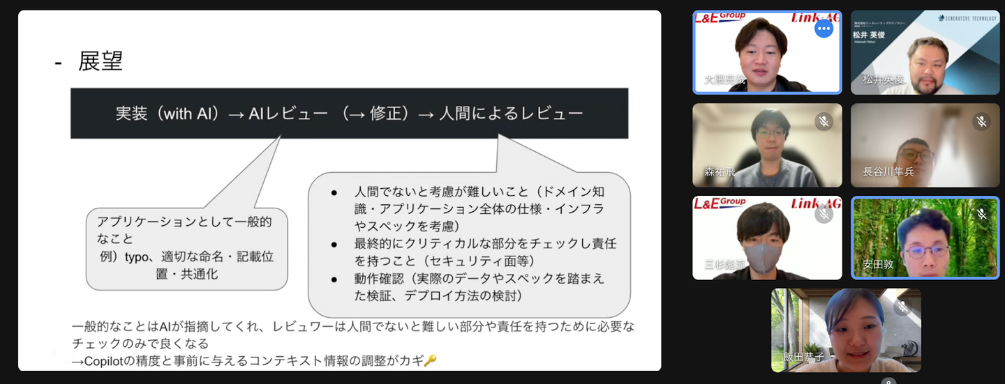 これらの課題に取り組むことで、次回のミーティングではより具体的な成果や知見を共有し、今後のレビューとAI活用に向けた取り組みをさらに推進していきます。