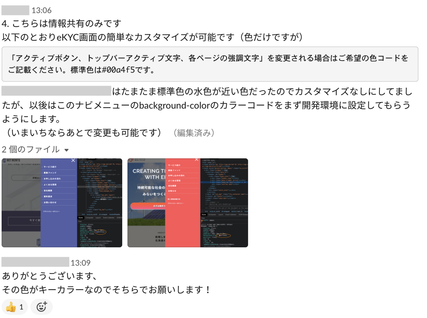 以下は外部との連携でキーカラーを指定できるためどの色を指定するかという話の流れで、バックエンド側より、先回りして動いていてくれている社内のやりとりです。