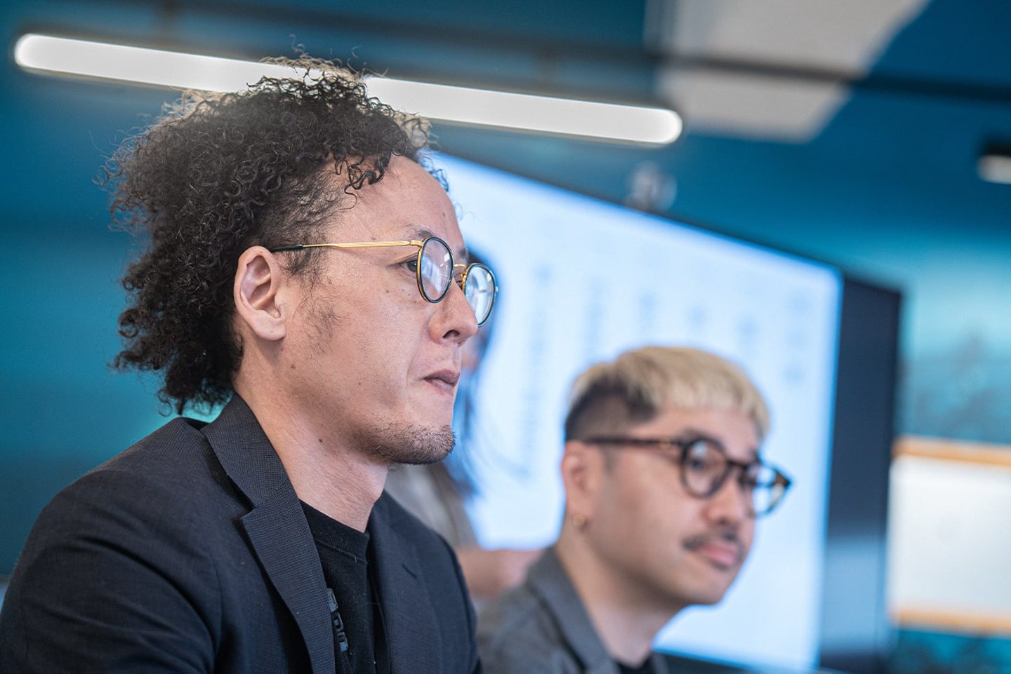 ▲テクノロジー部部長の工藤さん(手前)とデザイン部部長ののぼるさん(奥)も真剣な顔です。
