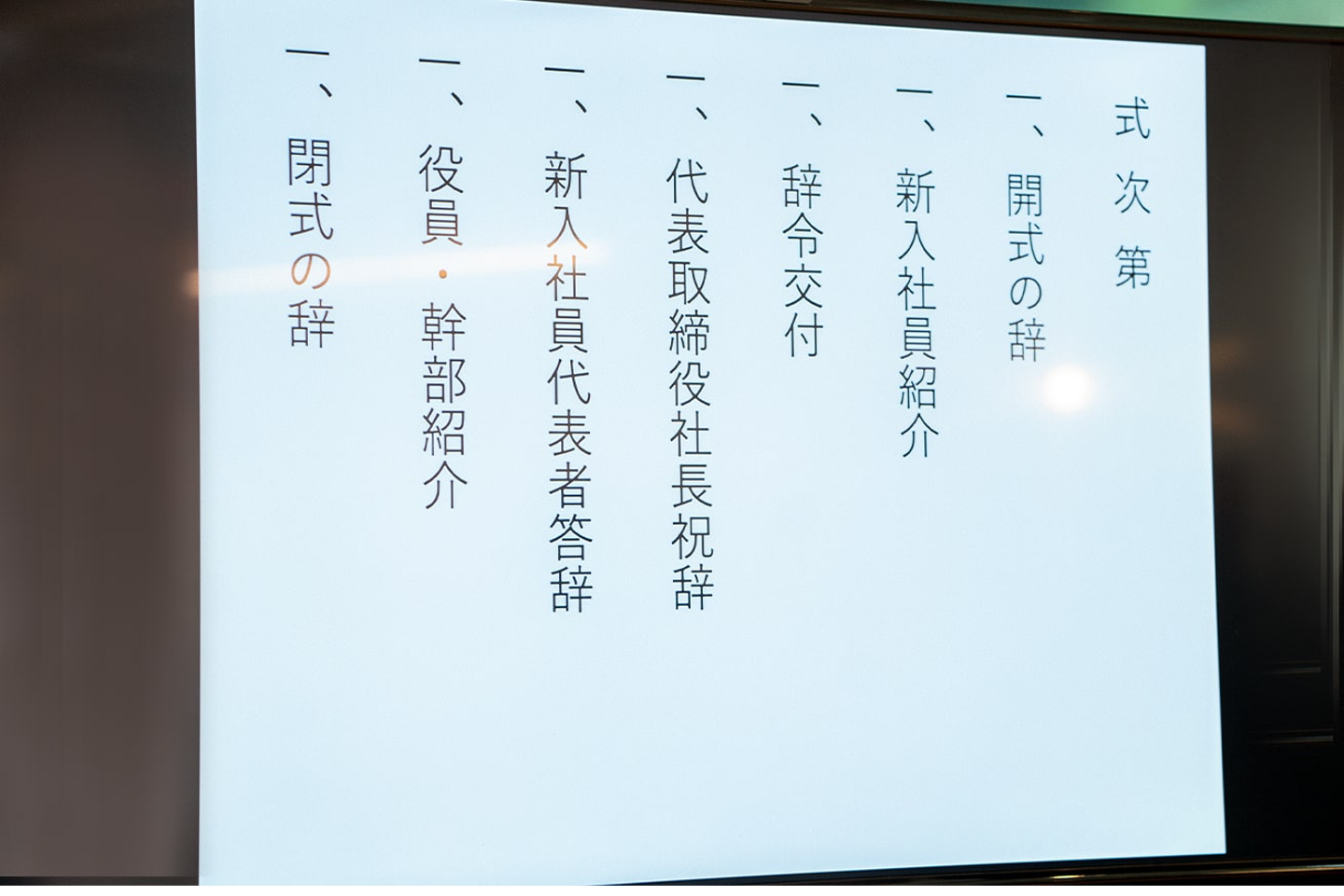 例年は役員室にてカジュアルな雰囲気での入社式をおこなっていましたが、今年からは一新。