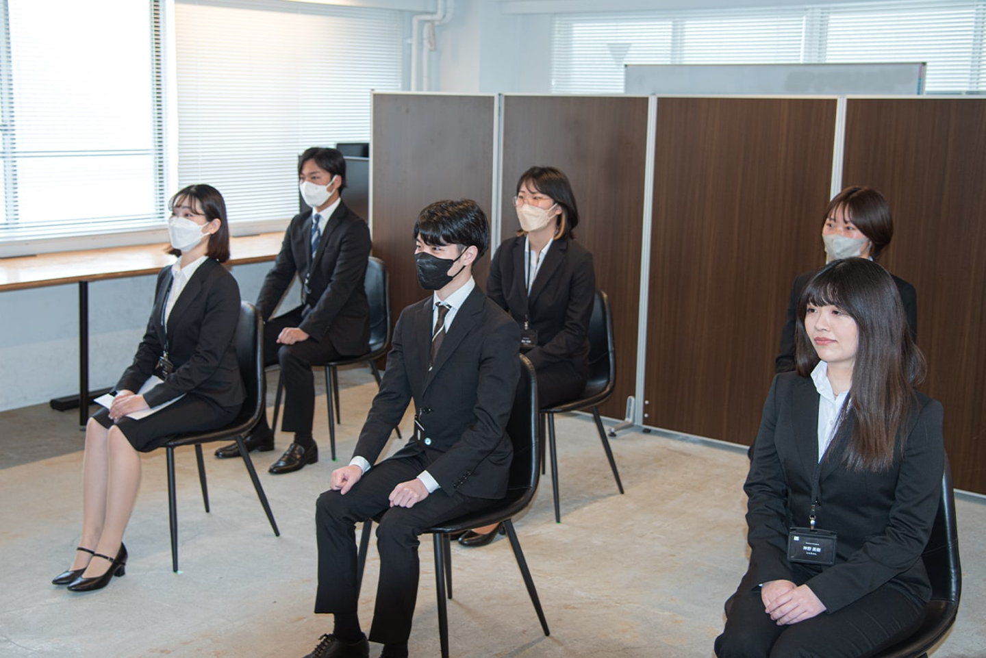 ▲開会前の様子。新卒6名は緊張した面持ちです。ちなみにマスク着用は個人の判断に任せていました。
