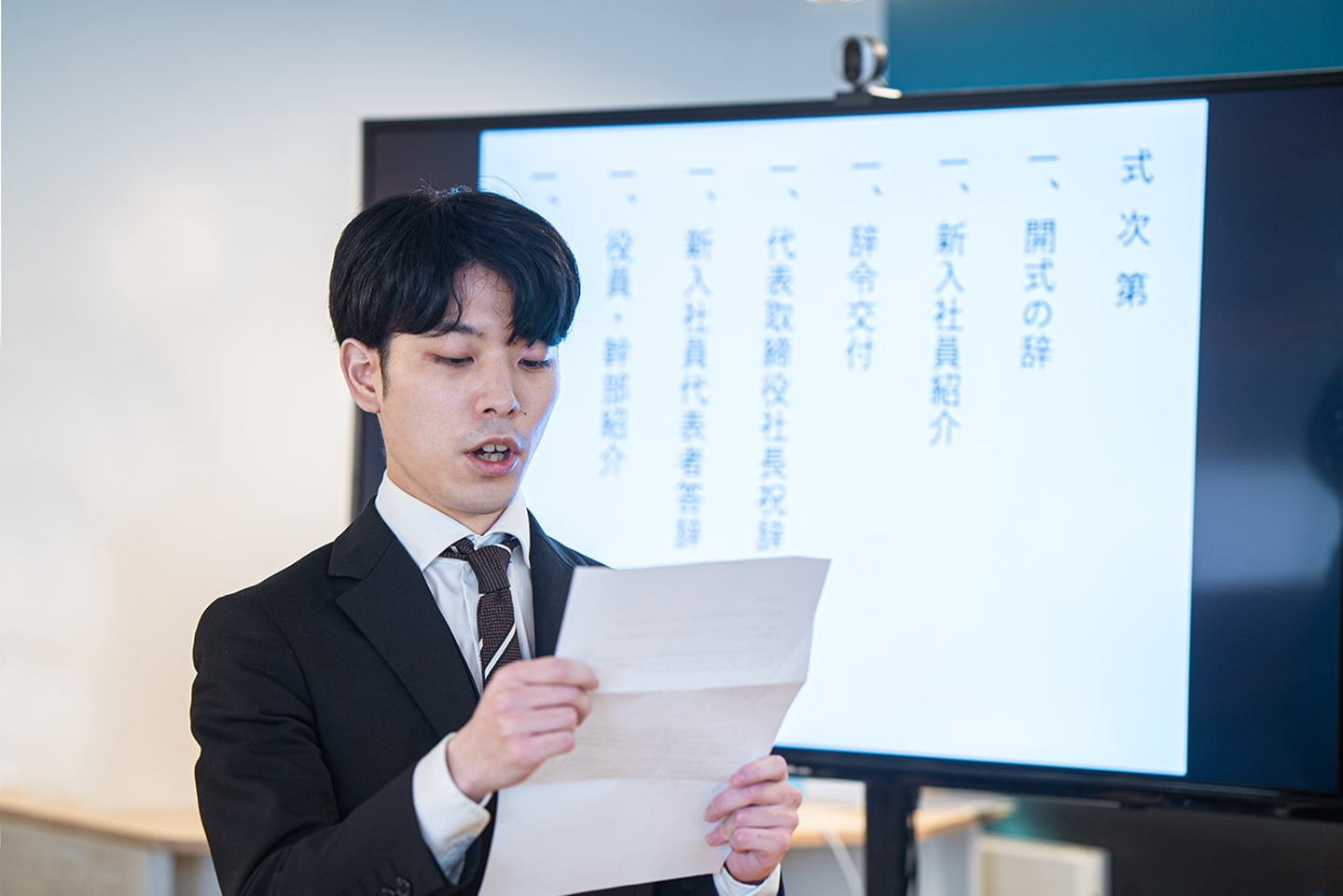 あっという間に式も中盤を迎え、社長祝辞に。大山さんからは、自己紹介を交えた熱いメッセージをいただきました。