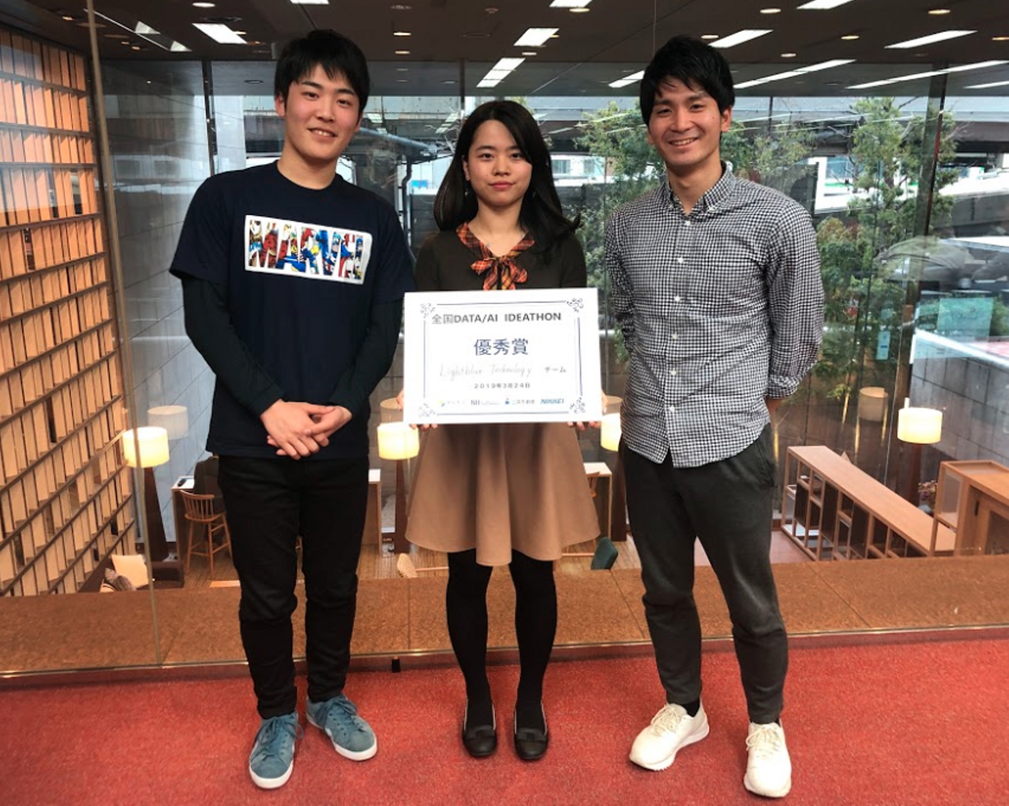 全国DATA・AIアイデアソンにエンジニアチーム3名で出場し、優秀賞を受賞しました。左はお馴染みの米一くん、真ん中が期待の新人井原さん(慶応大・医)、そして右が自分です。