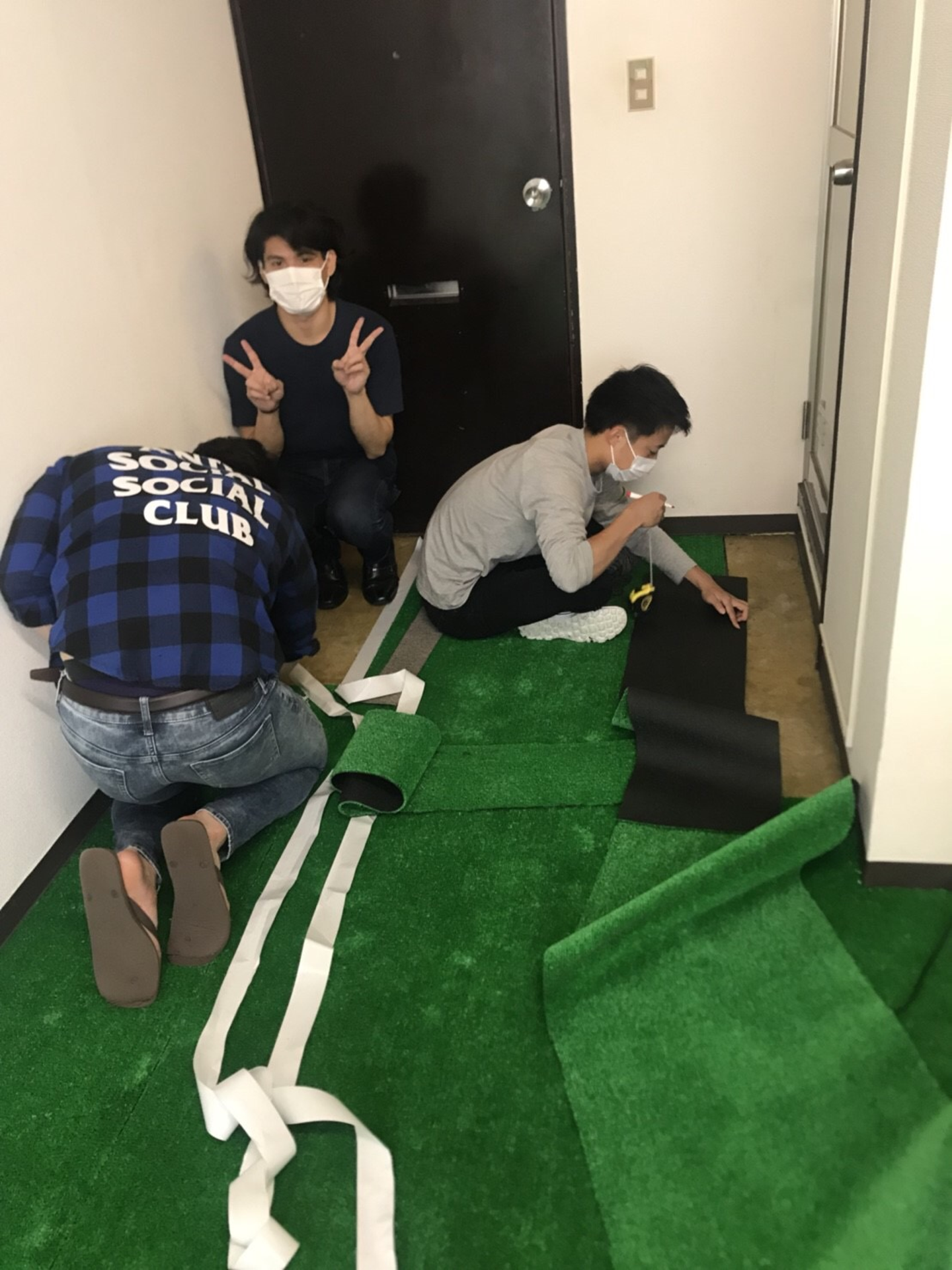丁寧に寸法を測りながら芝を敷いて、、、
