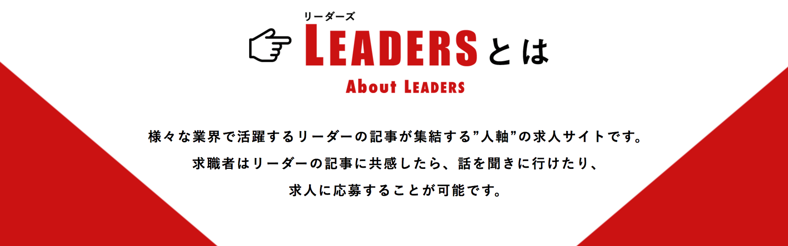 2017年4月4日に3人で設立。 同年の7月14日に、様々な業界で活躍するリーダーのインタビュー記事が集結する”人軸”の求人サイト「LEADERS」をリリース。(https://job-leaders.com/) 「世界中の一人ひとりが、新たな可能性の先にあるワクワクする世界の実現」とういビジョンを掲げ、事業を運営していきます。 世界中の一人ひとりの、無限の可能性を広げるために、自分たちが無限の可能性に挑戦し続けます。