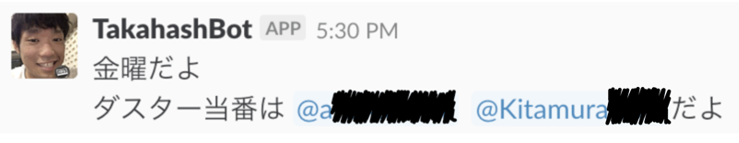 slack.post "木曜だよ\nダスター当番は <@XXXXXXXXXX> <@XXXXXXXXXX>だよ"