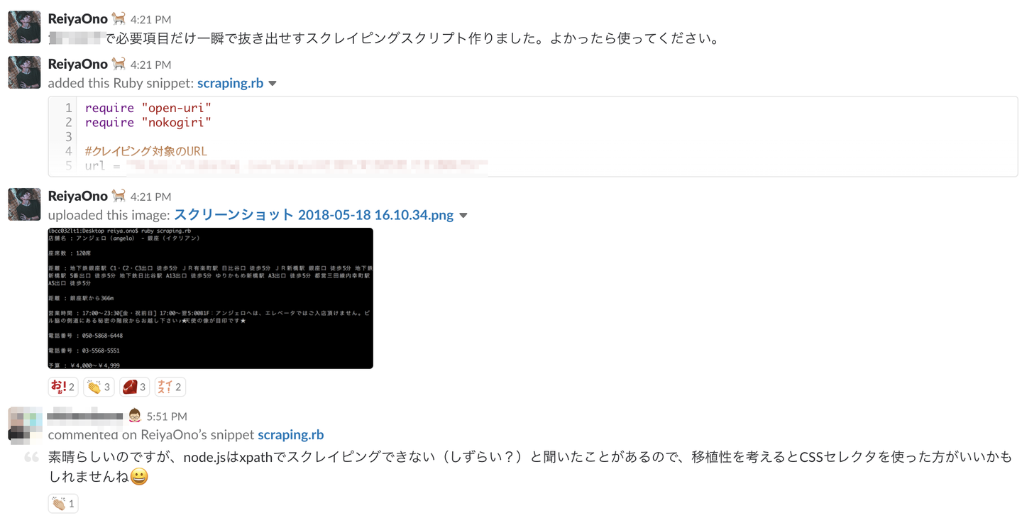 Slackにて自分が作ったスクレイピングのことを紹介すると、先輩社員からレスポンスが来ました。