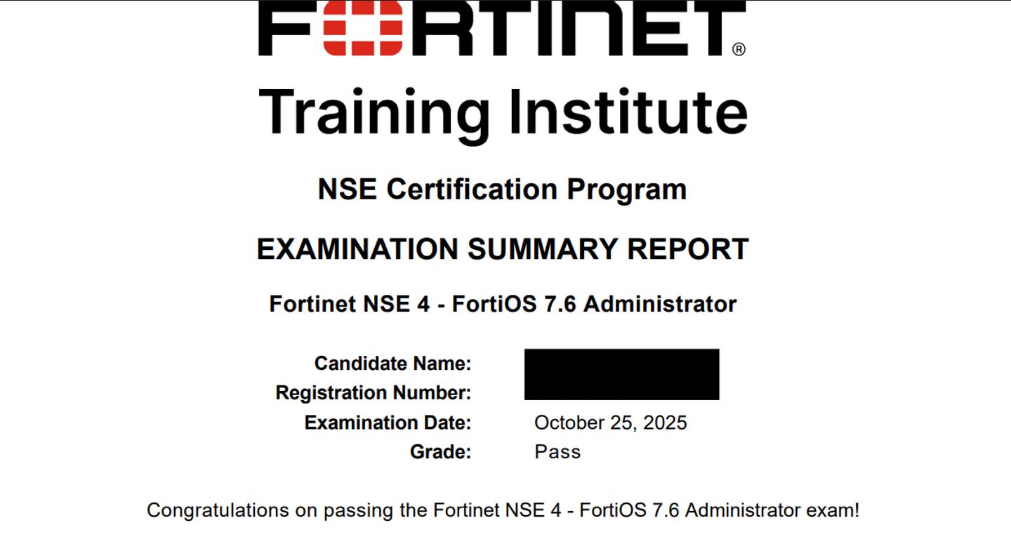 今回Fortinetの資格であるNSE4 FortiOS 7.6 Administrator を受験したため、その体験記を執筆します。日本語ドキュメントの少ない資格のため、これから受験を考えている皆様の一助となれば幸いです。