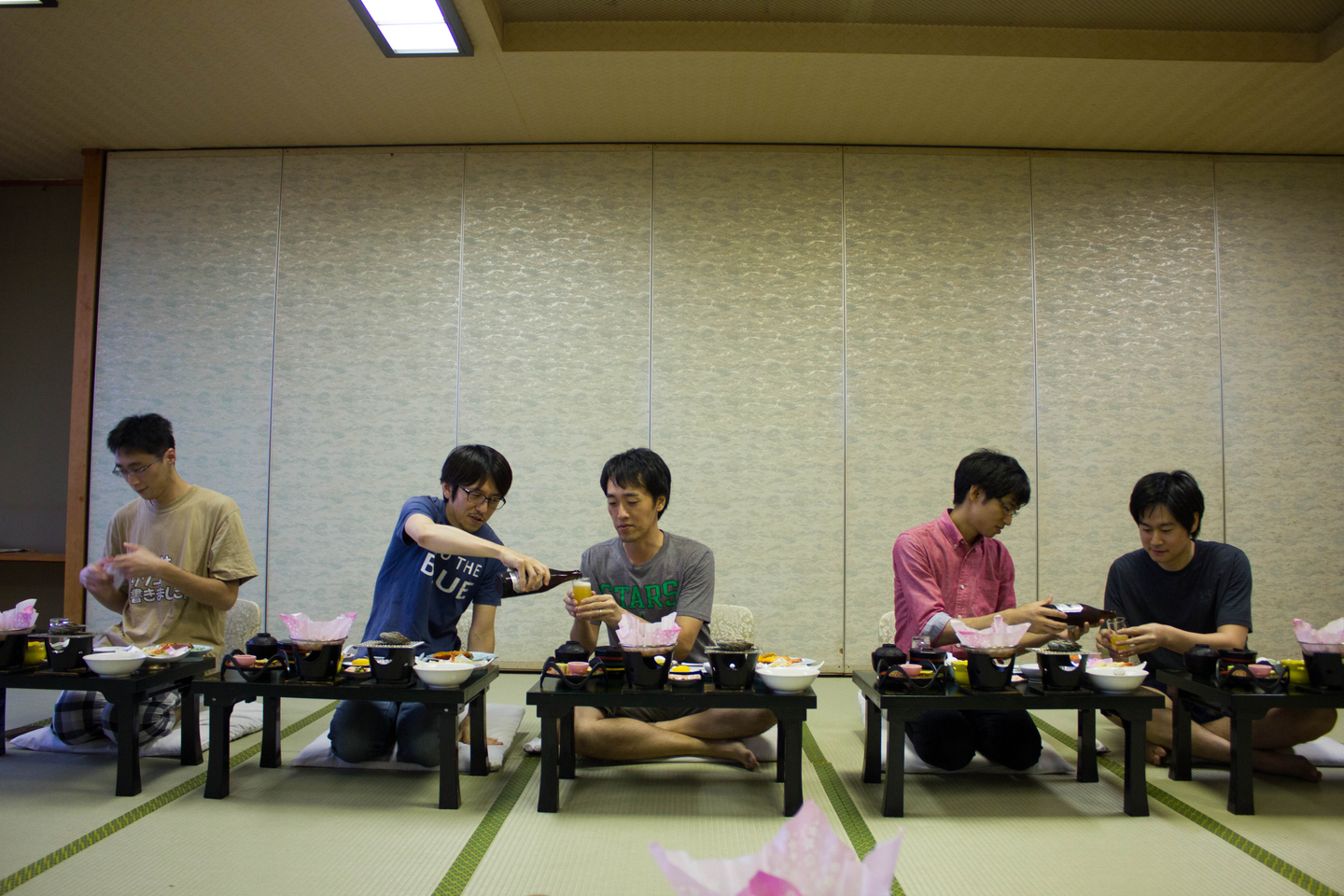 今回は1か所で全員が作業できることを重視したかったので、10名が1部屋で予約できる熱海の玉の湯ホテルさんに宿泊しました。部屋にはWiFiがなかったのでレンタルモバイルWiFiでネットに繋いで作業しました。チェックインしたら早めの夕飯です。